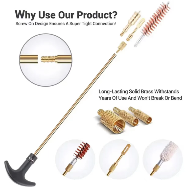 The key components are made of brass, with moderate hardness. They can effectively remove stubborn carbon deposits while not scratching the inner wall of the barrel, thus protecting the rifling accuracy. The copper wire brush has high hardness and can remove stubborn dirt forcefully; the nylon brush and cotton brush are soft in texture and suitable for daily basic cleaning and polishing. With multiple brush heads, they are suitable for different cleaning stages, providing efficient and safe cleaning.