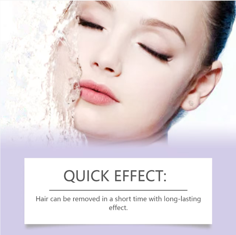 The cooling essence in the set is an even more thoughtful finishing touch., containing aloe extract. After hair removal, applying it can immediately soothe the skin, providing a refreshing cool sensation, further reducing the risk of redness, and leaving only smooth and hydrated skin. The precise applicator head and the accompanying scraper make the operation simpler: simply apply evenly to the hair area, wait for 5-8 minutes, then gently scrape off, rinse with water, and it's done. It can be easily accomplished during morning skincare or bathing, and busy office workers can also maintain a refined state effortlessly.