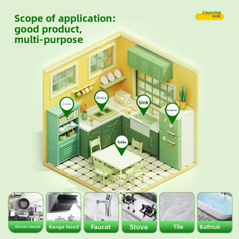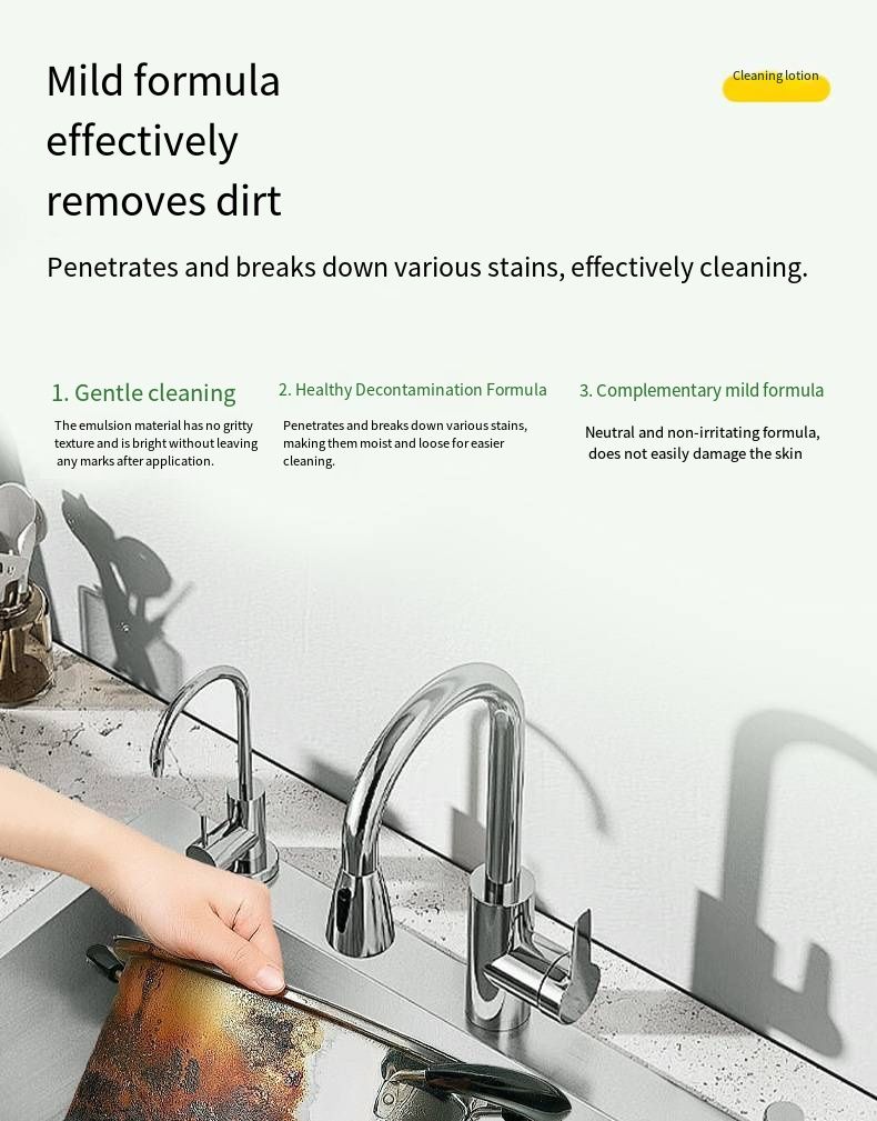 Its core healthy dirt-removing formula can deeply penetrate the inside of stains, fully softening and breaking down stubborn oil stains, scale, rust stains, etc., and the emulsified non-particle texture ensures that no scratches or marks will be left on the surface after wiping.