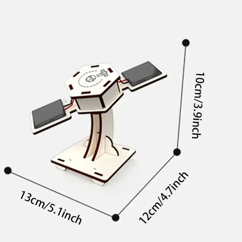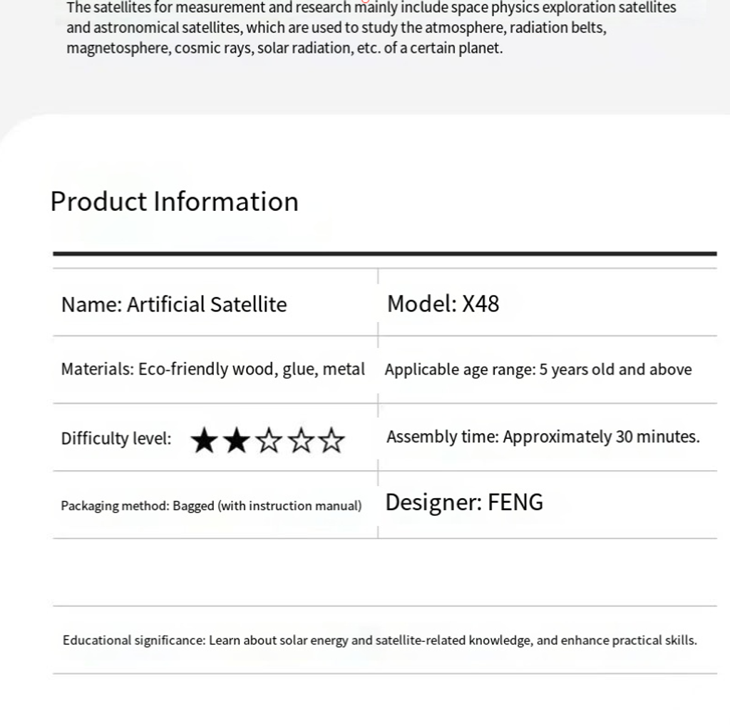 It is made of eco-friendly wooden panels. All the parts are laser-cut and the edges are smooth without any burrs. Children won't worry about getting their hands hurt when assembling it. The assembly can be completed in about 30 minutes. Follow the instructions step by step to assemble the frame, install the solar panels, and fix the satellite main body. During the process, hand dexterity and spatial thinking abilities can be exercised, and the sense of achievement will be overwhelming.