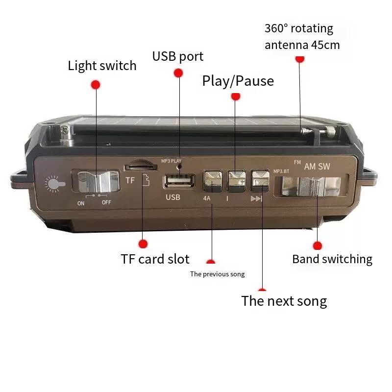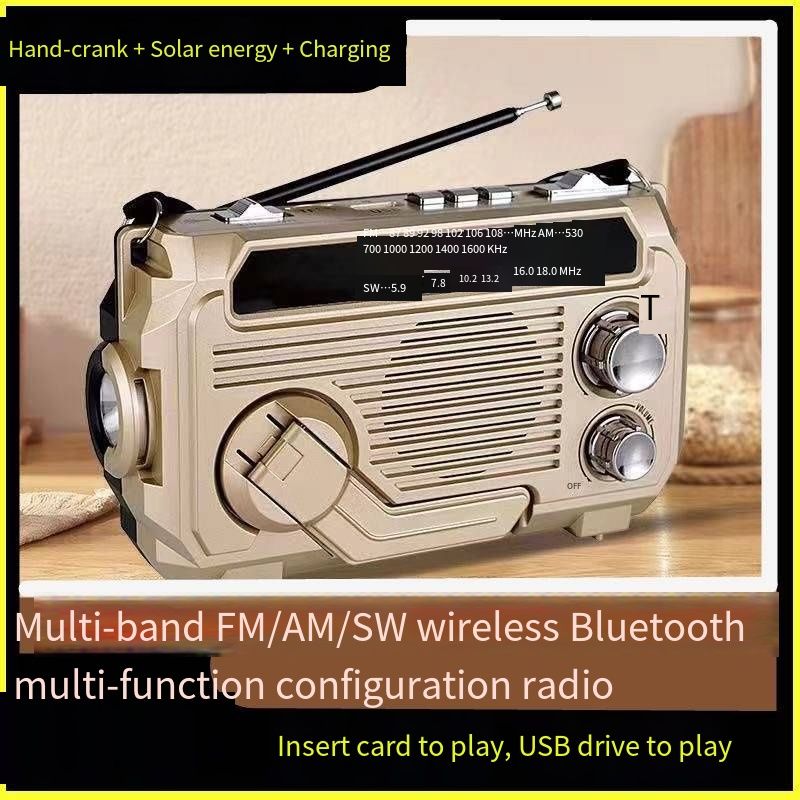 Multifunctional Emergency Radio: Your Reliable Survival CompanionThis portable radio is designed for both outdoor adventures and emergency preparedness. It features AM/FM/SW multi-band reception with a 45cm 360° rotating antenna for clear signal reception. Equipped with hand crank, solar, and USB charging, it ensures power is always available. Enjoy Bluetooth, TF card, and USB playback, plus a built-in LED flashlight and SOS alarm for safety. Its rugged, water-resistant design makes it ideal for camping, hiking, and power outages, keeping you connected and safe when you need it most.