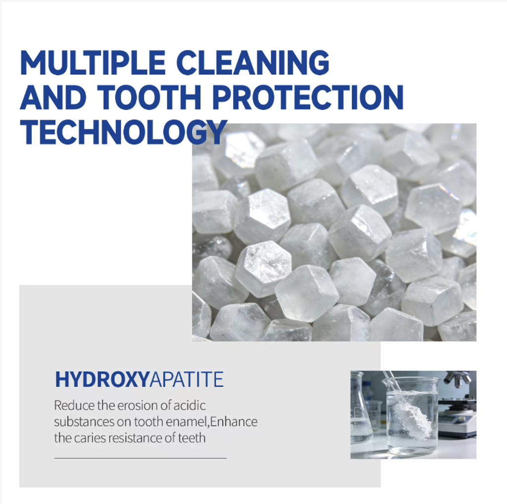 Nano-hydroxyapatite is highly similar to the components of tooth enamel and can precisely fill in the tiny defects and mineralization loss areas of tooth enamel, forming a biomimetic protective layer. Consistent use can effectively improve tooth sensitivity and fragility problems, allowing tooth enamel to regain strength and health, and reducing the attachment of stains from the source.