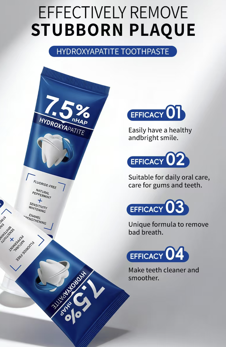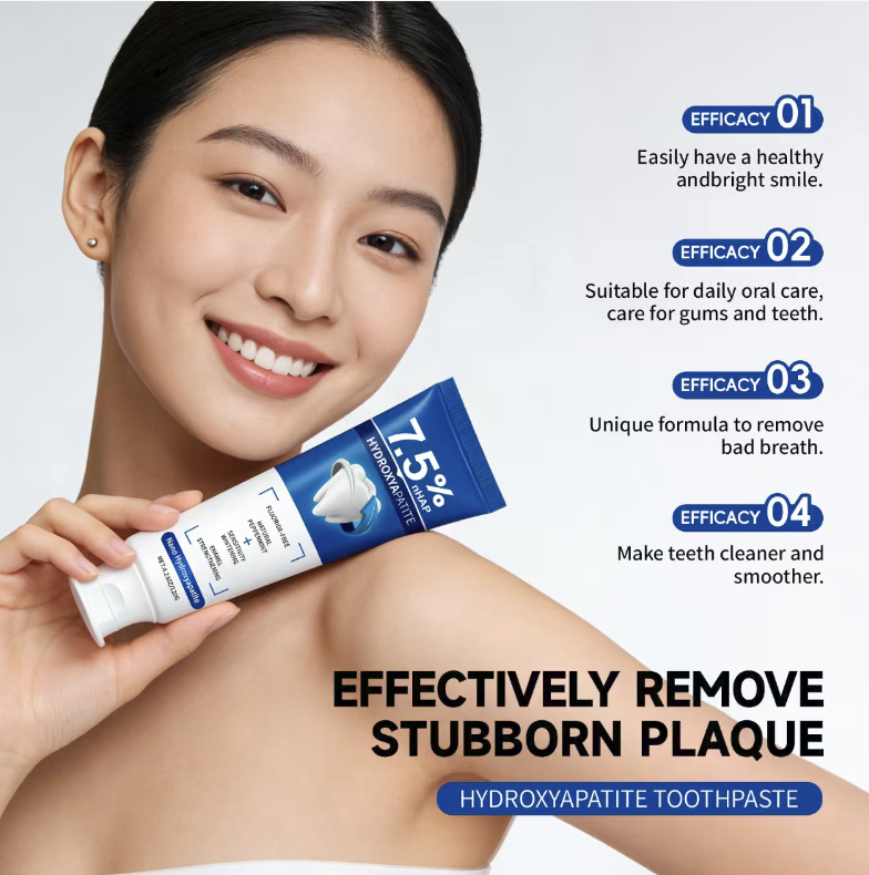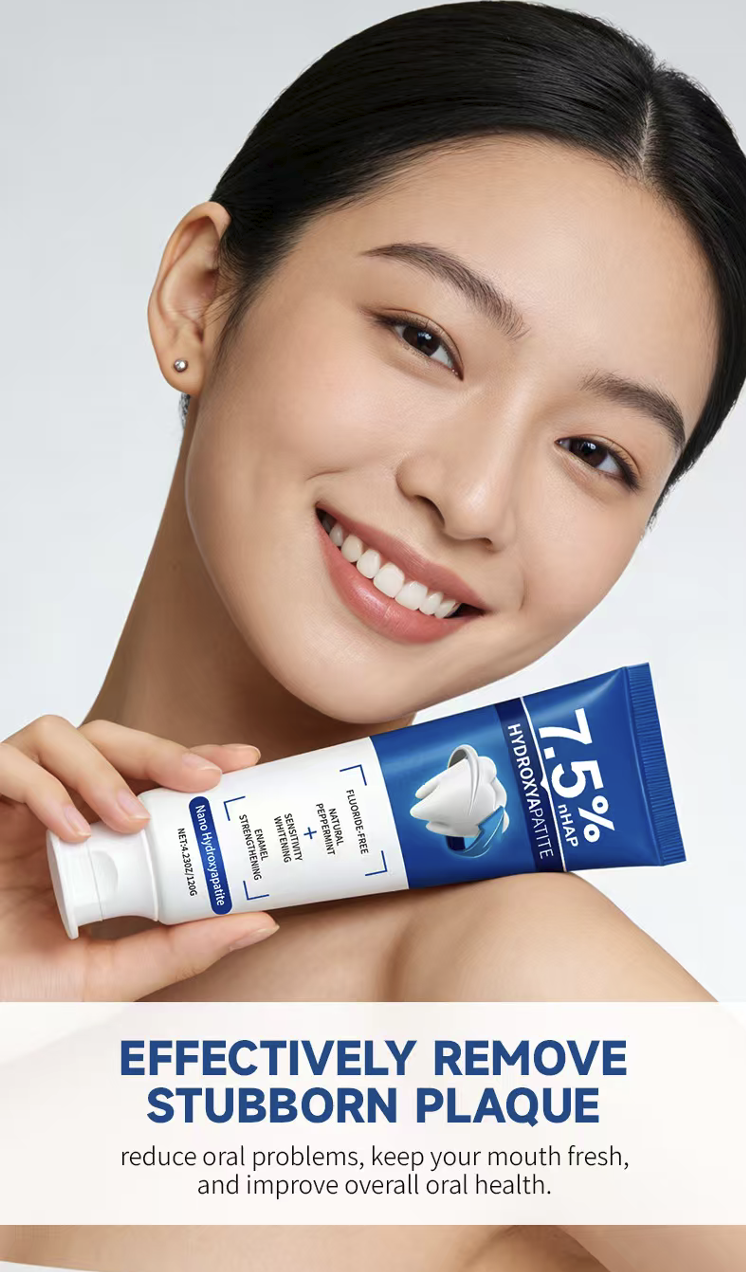 Nano hydroxyapatite is highly homologous to the components of tooth enamel and can precisely fill the tiny defects and mineralization loss areas of tooth enamel, forming a biomimetic protective layer. By consistently using it, it can effectively improve tooth sensitivity and fragility issues, allowing the tooth enamel to regain strength and health, and reducing the attachment of stains from the root cause.Are you still afraid to laugh heartily because of yellow teeth, stubborn stains, or damaged tooth enamel? This professional toothpaste containing 7.5% nano-hydroxyapatite (nHAP) features a "repair + whitening" dual-effect formula, which can improve the health of tooth enamel at its source, gently remove yellowing and stains, and restore teeth to a healthy and bright white state, safeguarding your confident smile.