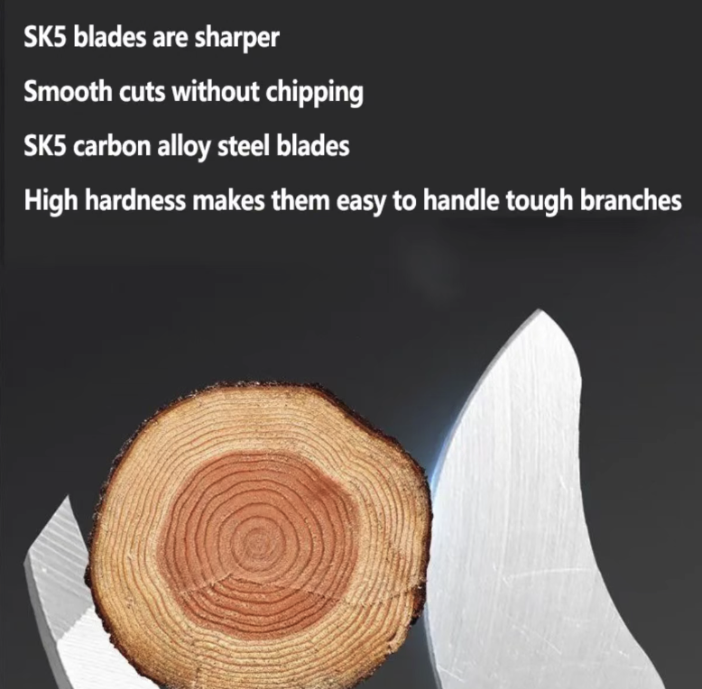 The electric saw chain and pruning shears blade are made of SK5 carbon alloy steel, with high hardness and strong wear resistance. It cuts thick branches neatly and efficiently without the need for repeated operations. The electric saw's automatic lubrication system reduces chain wear, and the precise bite of the pruning shears' blade ensures that thick branches can be cut in one second without splitting, with a smooth and non-fractured cut.