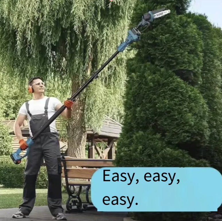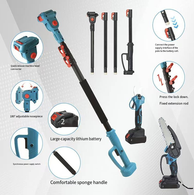 Combining handheld electric saw, high branch electric saw, handheld pruning shears, and high branch pruning shears, along with a telescopic extension rod, it can easily switch between different operation modes. Whether it's cutting rough ground wood, trimming low branches, or reaching branches as high as several meters, it can precisely handle them, saying goodbye to the cumbersome process of carrying multiple tools.