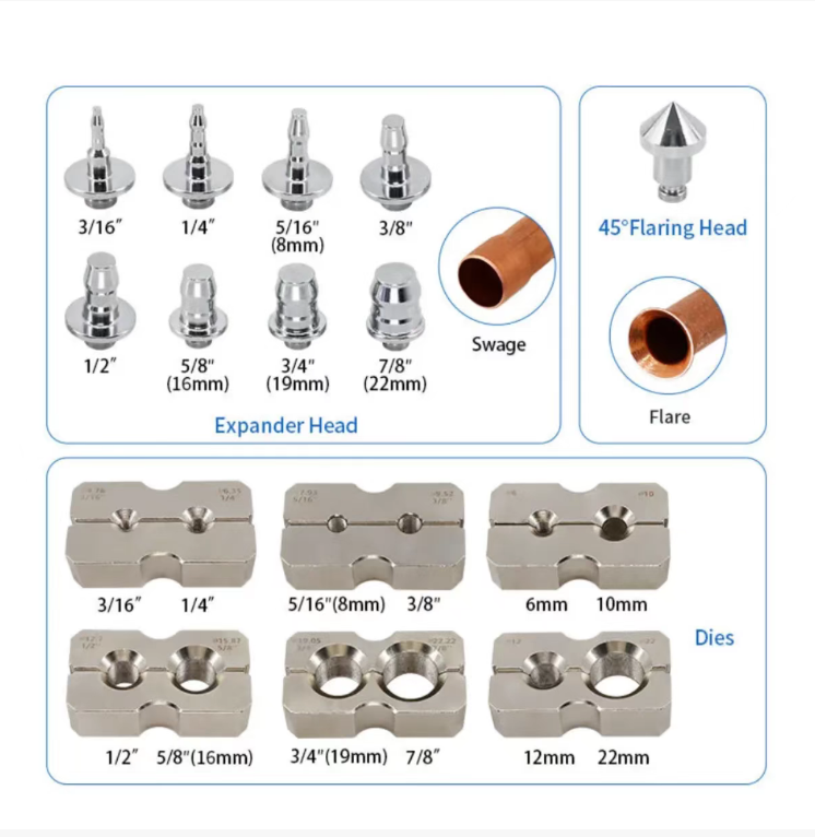 The kit includes various expansion molds of different specifications, suitable for different diameters of pipes such as brake oil pipes, air conditioning copper pipes, and fuel pipes. It can handle the repair needs of common vehicle oil pipes in one set. The molds are made of high-hardness alloy steel, wear-resistant and durable, and do not deform over time. The expansion specifications are stable, suitable for copper pipes and aluminum pipes of different diameters, meeting the multi-scenario needs of auto repair and pipe modification.