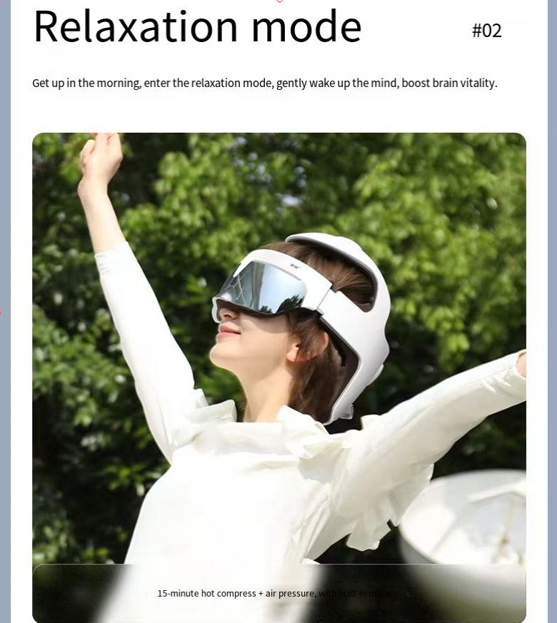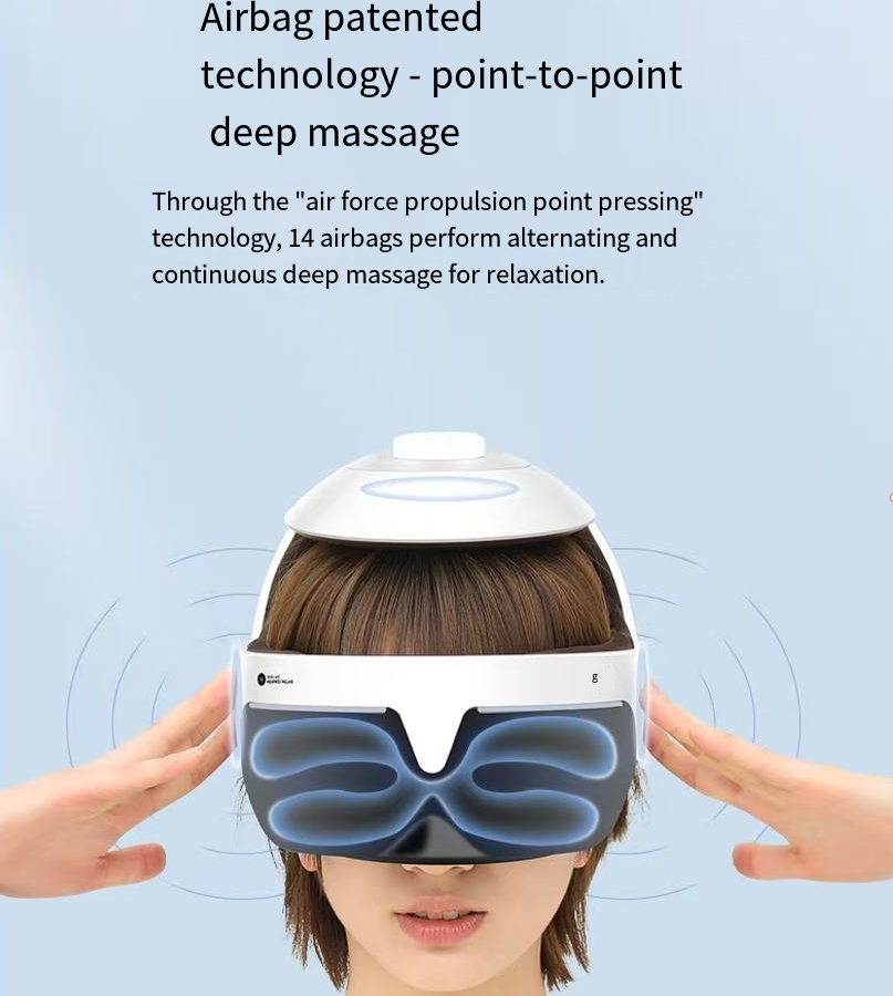 Electric head massager, with 14 layers of airbags precisely covering 21 acupoints of the head, eyes and neck. Alternating techniques of kneading, pressing and pushing. Graphene constant-temperature heat therapy relieves fatigue. Supports HiLink smart connection. The APP allows for DIY adjustment of force and temperature. The hollow eye-shaped design does not press on the eyeballs. It can recharge your body and mind anytime and anywhere.