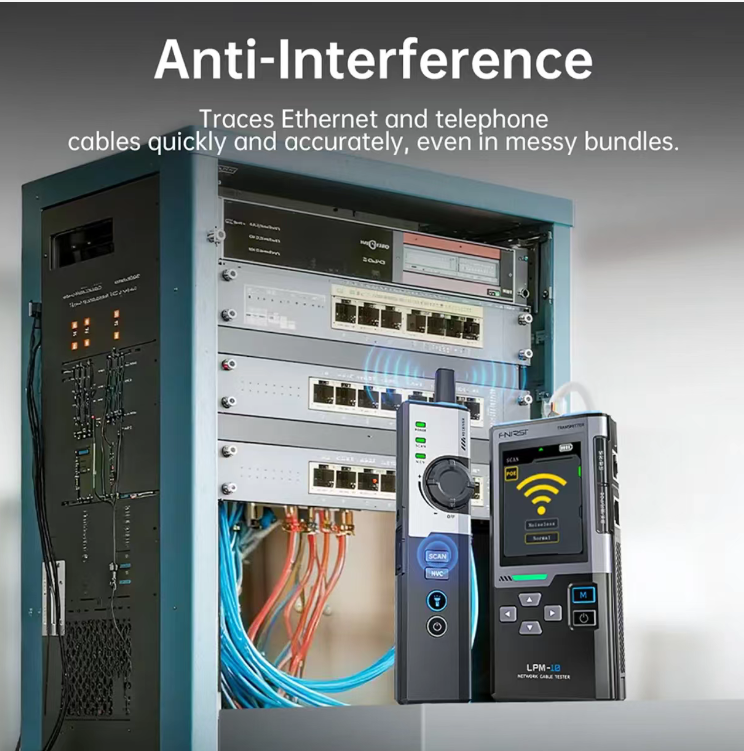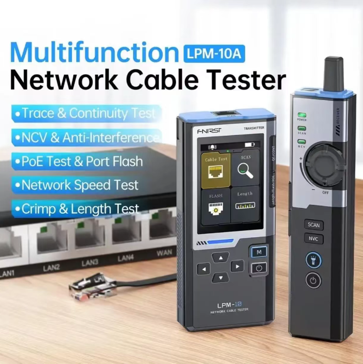 FNIRSI LPM-10 Multi-functional Wire Tracing Instrument, capable of performing cable tracing, continuity and interruption length testing, PoE detection, NCV electrical testing and network speed measurement. With a 2.4-inch color screen for visual operation, it features 60V voltage withstand safety protection. Its portable and integrated design makes it a professional-level all-in-one diagnostic tool for network cabling and maintenance.