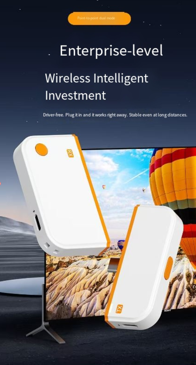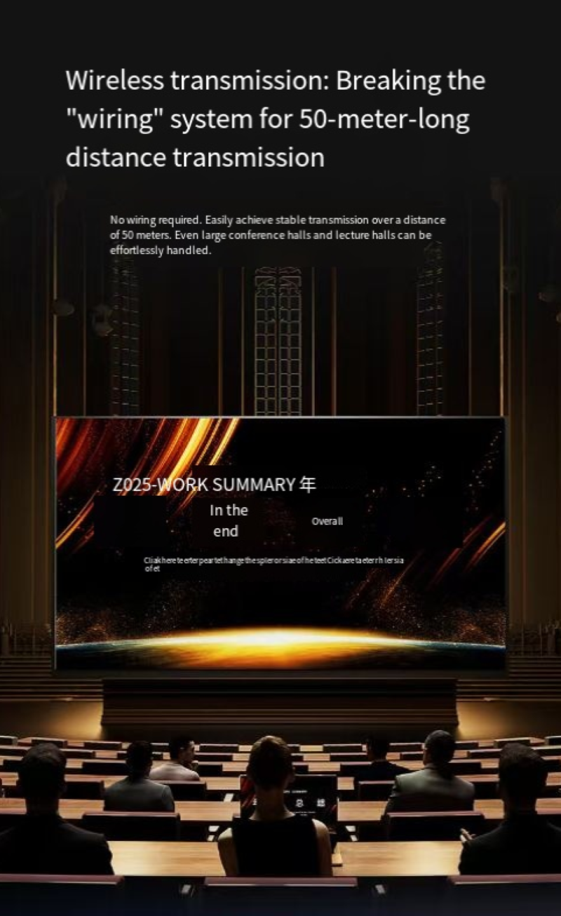 HDMI conference screen sharing device, supporting point-to-point wireless transmission up to 50 meters, plug-and-play without WiFi. 60Hz high refresh rate ensures smooth picture display. Compatible with multiple devices. The transmitting end does not require power supply, and the receiving end comes with its own hotspot. It is a professional tool for enhancing collaboration efficiency in enterprise meetings and business presentations.