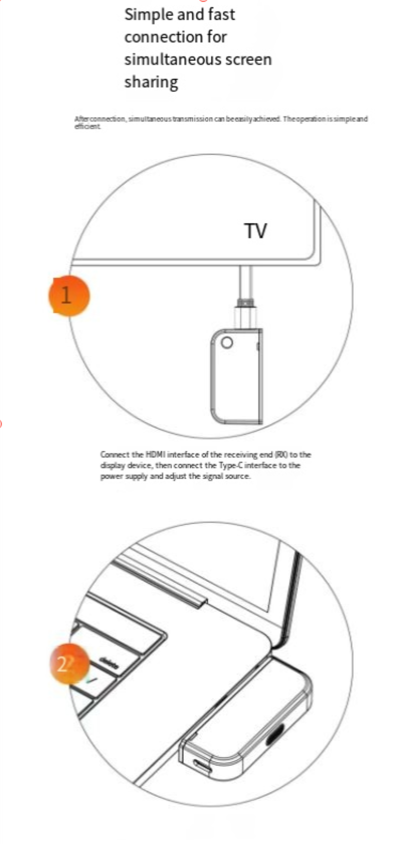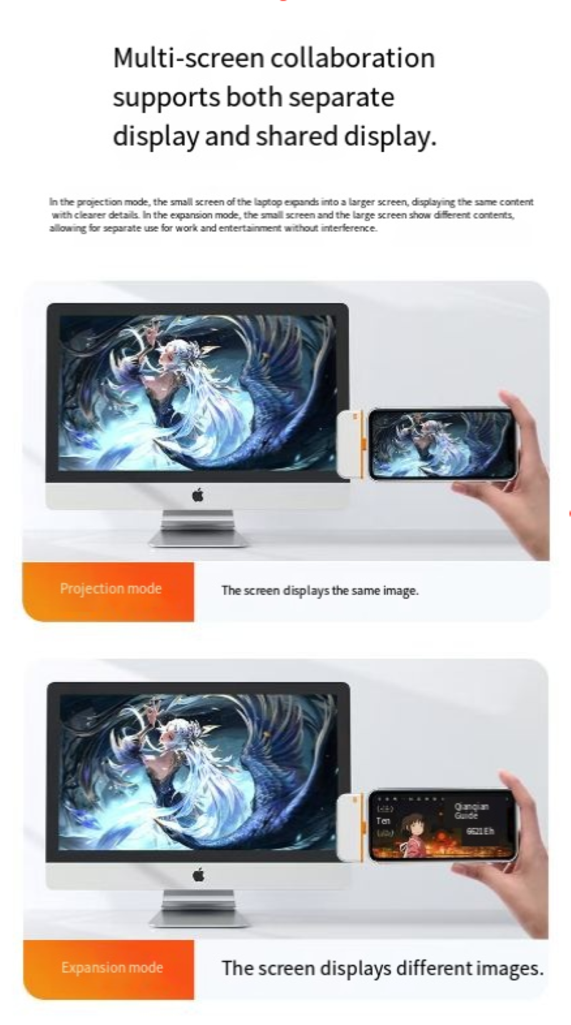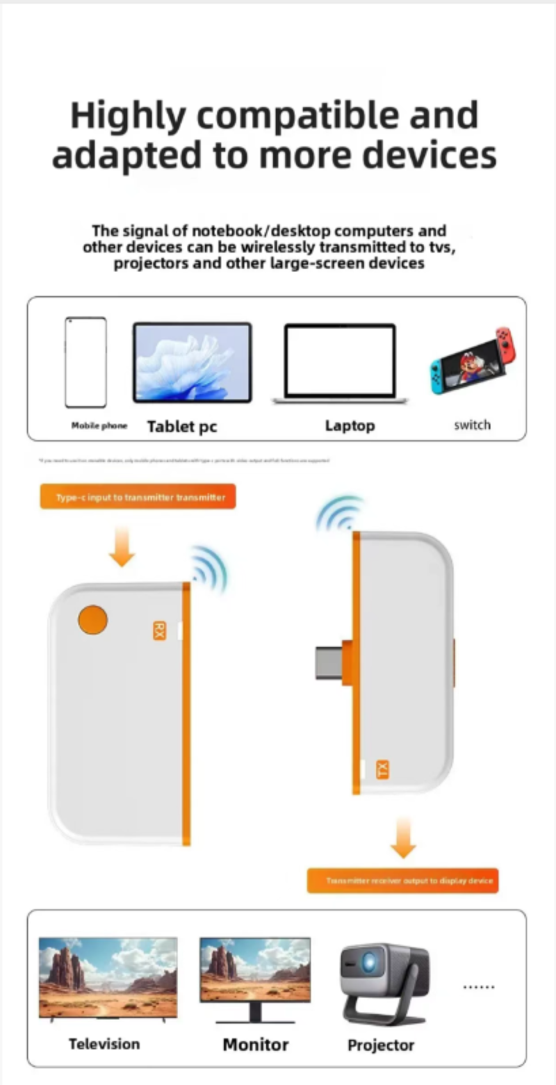 It uses point-to-point 50-meter long-distance transmission technology and does not rely on WiFi networks. It can establish stable connections even in complex meeting rooms, avoiding the risks of network lag and disconnection on public networks. The transmitting end does not require additional power supply and can be plugged in and used immediately. It is compatible with multiple devices such as mobile phones, tablets, and laptops. The receiving end comes with a hotspot, allowing it to simultaneously connect to multiple transmitting ends and support multiple devices to take turns projecting screens, meeting the needs of multi-person collaborative presentations.