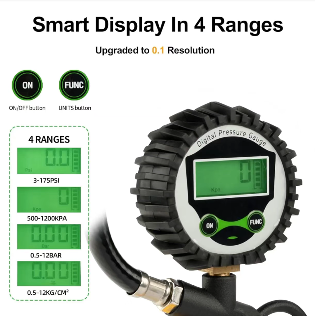 High-precision digital pressure gauge, with a wide range of 0 - 200 PSI and an accuracy of 0.05 kg cm². It can be switched between four units with one click. The bright LCD backlight screen, gun-shaped non-slip grip, and explosion-proof hose, along with rubber protection for shock resistance and durability, make it a professional tool for auto repair, off-road driving, and outdoor inflation pressure measurement.