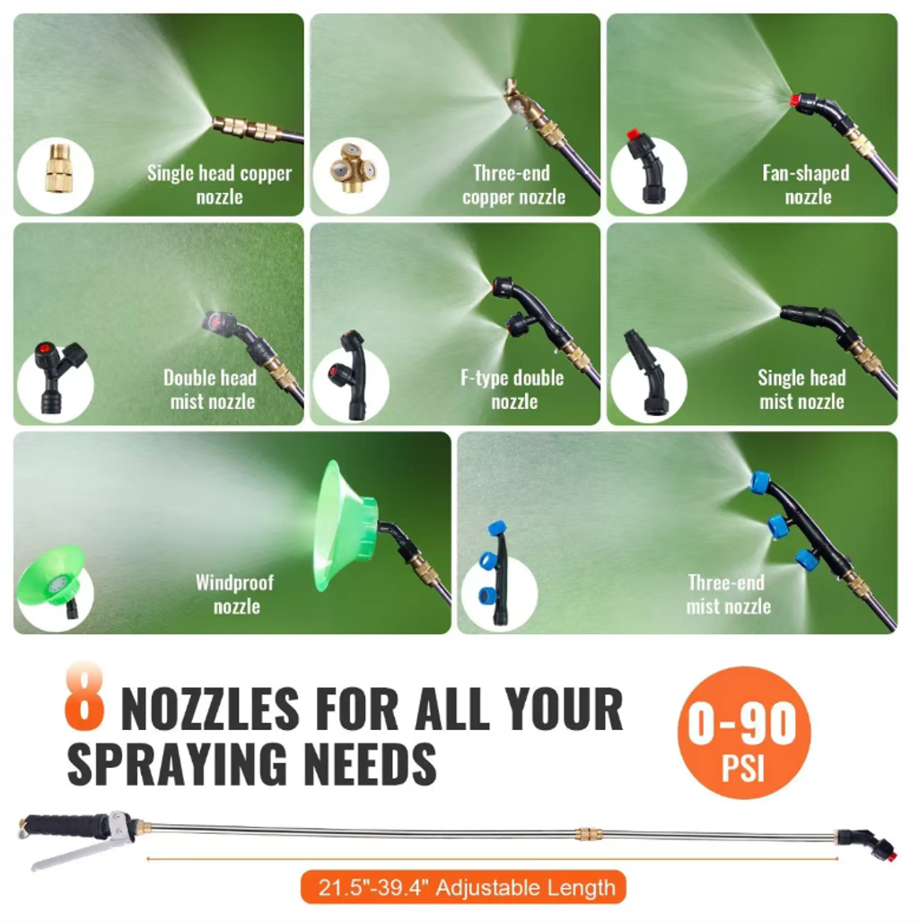 It is equipped with a 12V/8Ah large-capacity lithium battery, which can provide continuous operation for 4 to 6 hours after a single charge. It completely eliminates the cumbersome process of manual pump pressure, allowing you to say goodbye to backaches and soreness. The pressure can be adjusted from 0 to 90 PSI. It is compatible with 8 interchangeable nozzles (single copper nozzle, three-end copper nozzle, wind-proof cover, double nozzles, etc.), precisely adapting to different scenarios: the fine mist nozzle is used for indoor disinfection, the wide spray nozzle covers the lawn, the long pole penetrates the gaps in green plants. Whether it is for garden weeding, farm spraying, epidemic prevention and disinfection, or pet deworming, it can complete the task efficiently.