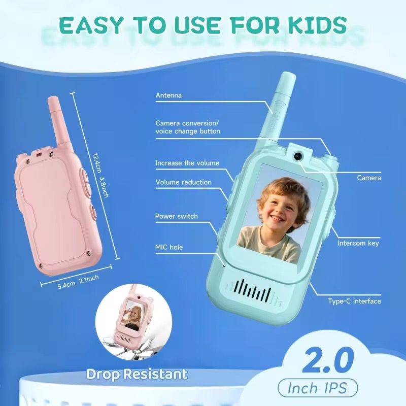 Introducing the 2 Pack Kids Walkie Talkies with Camera & 1.77'' Color Screen, the ultimate interactive toy for boys and girls aged 3-12 who love to explore, imagine, and stay connected. These rechargeable two-way radios combine the fun of traditional walkie talkies with exciting new features like a built-in camera, color screen, voice changer effects, and entertaining games, making them perfect for both indoor and outdoor play.