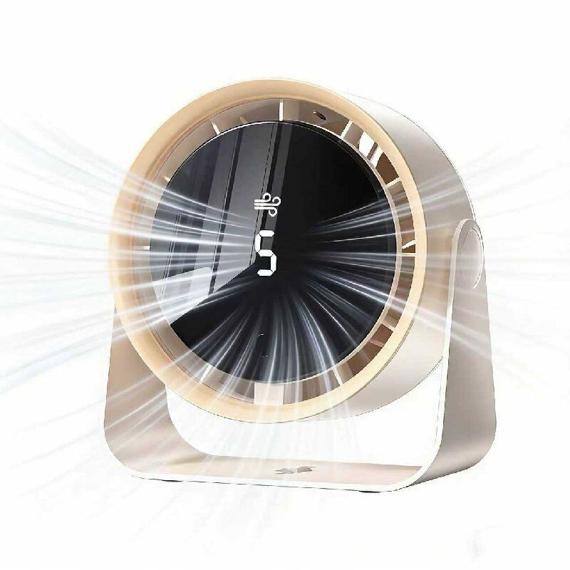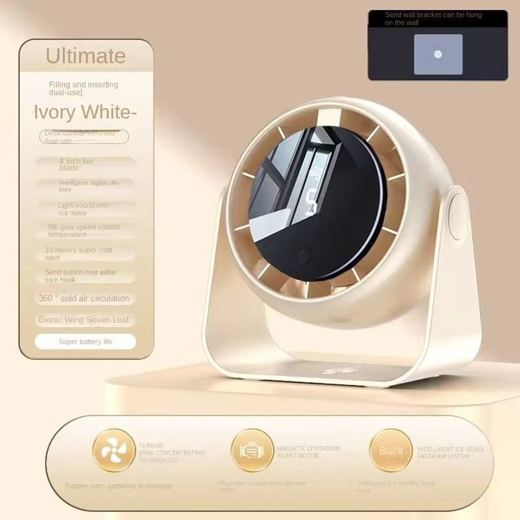Multifunctional ambient cooling fan: Ivory white luxurious appearance, intelligent digital display panel, turbo vortex wind for cooling 360° all-round circulation, desk-mounted and wall-mounted dual use, no installation required, bionic seven-leaf silent air delivery 10-meter ultra-long cooling range, it is not only a cooling device but also a desktop home atmosphere decoration piece