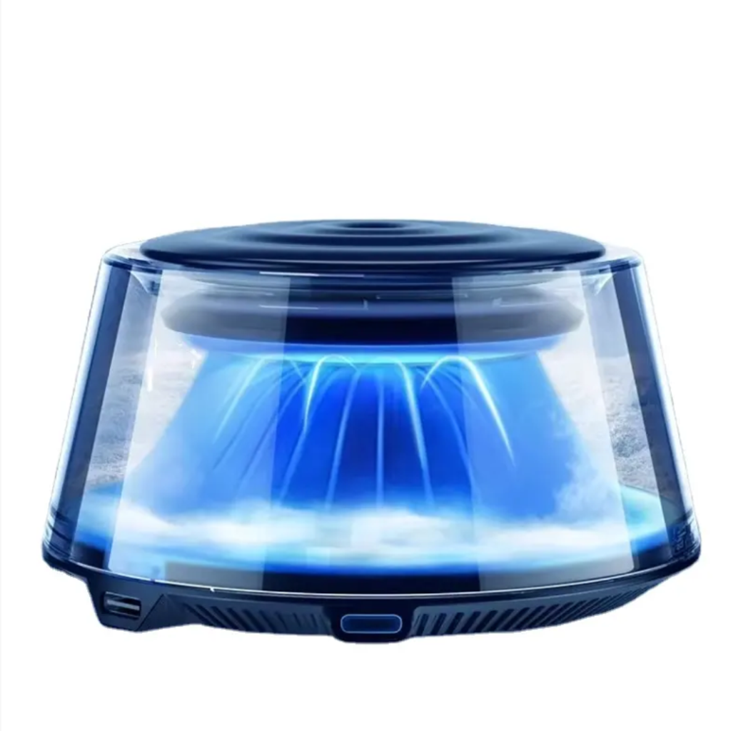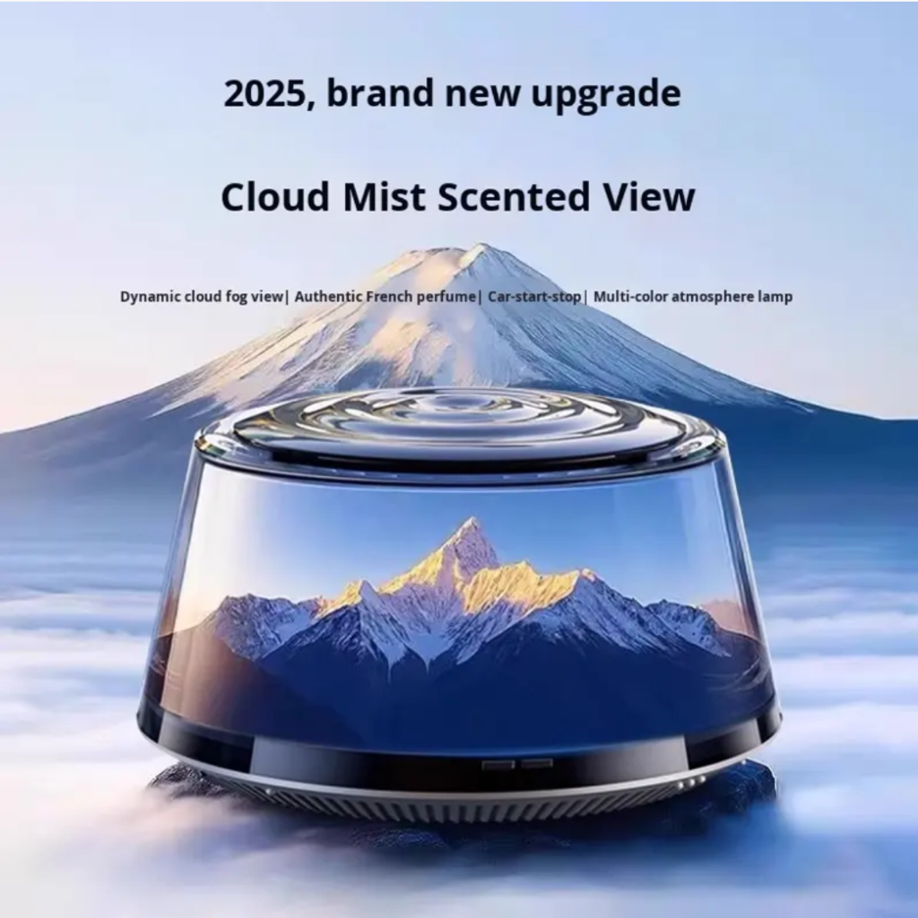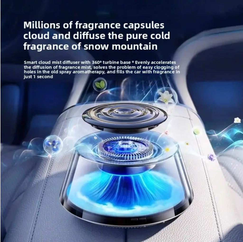 It features a transparent dome design and is combined with dynamic blue light fogging effect. When activated, it resembles the surging ice fog on the summit of a snow-capped mountain. Five color atmosphere lights slowly change in rhythm with breathing, creating a quiet and healing visual experience in the car. The intelligent fogging technology finely decomposes French imported fragrance essential oils, diffuses them evenly in 360 degrees, and releases natural and refreshing scents without the need for heating, avoiding the strong and pungent smell of traditional scented candles.