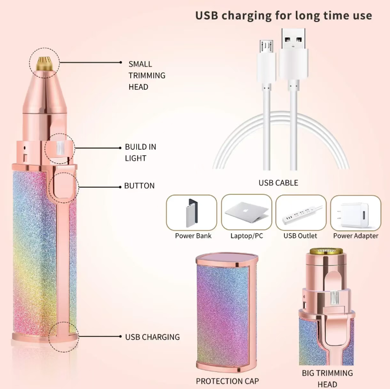 The shiny gradient glittery shell paired with the gold border makes it look like you're carrying a high-end makeup bag when you put it in your bag. When you take it out to touch up your makeup, you can also trim your eyebrows. Your friends will all be asking for the link. The lipstick-sized body is so compact that you can take it out and use it anytime, anywhere, without taking up much space. It's a must-have for any girl who loves elegance!