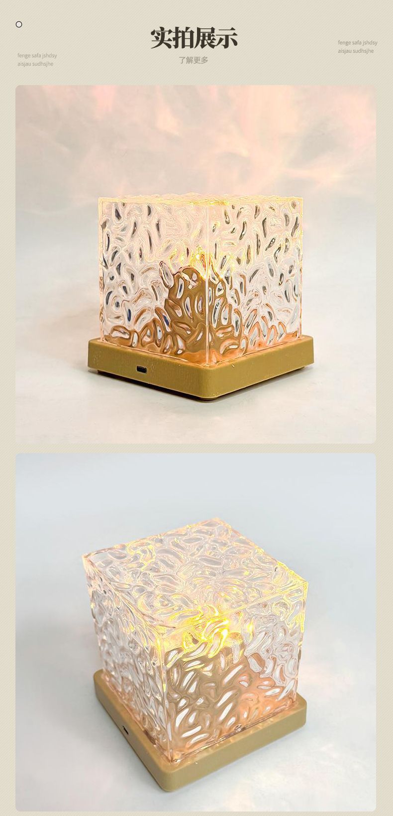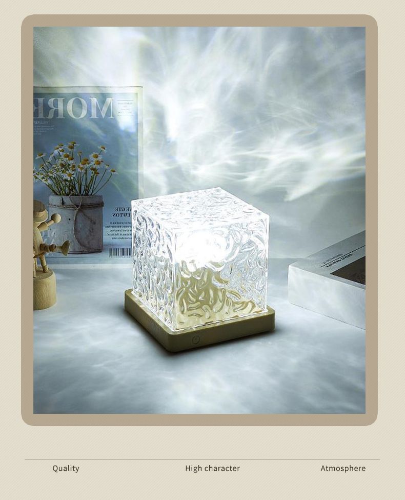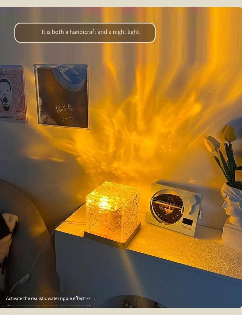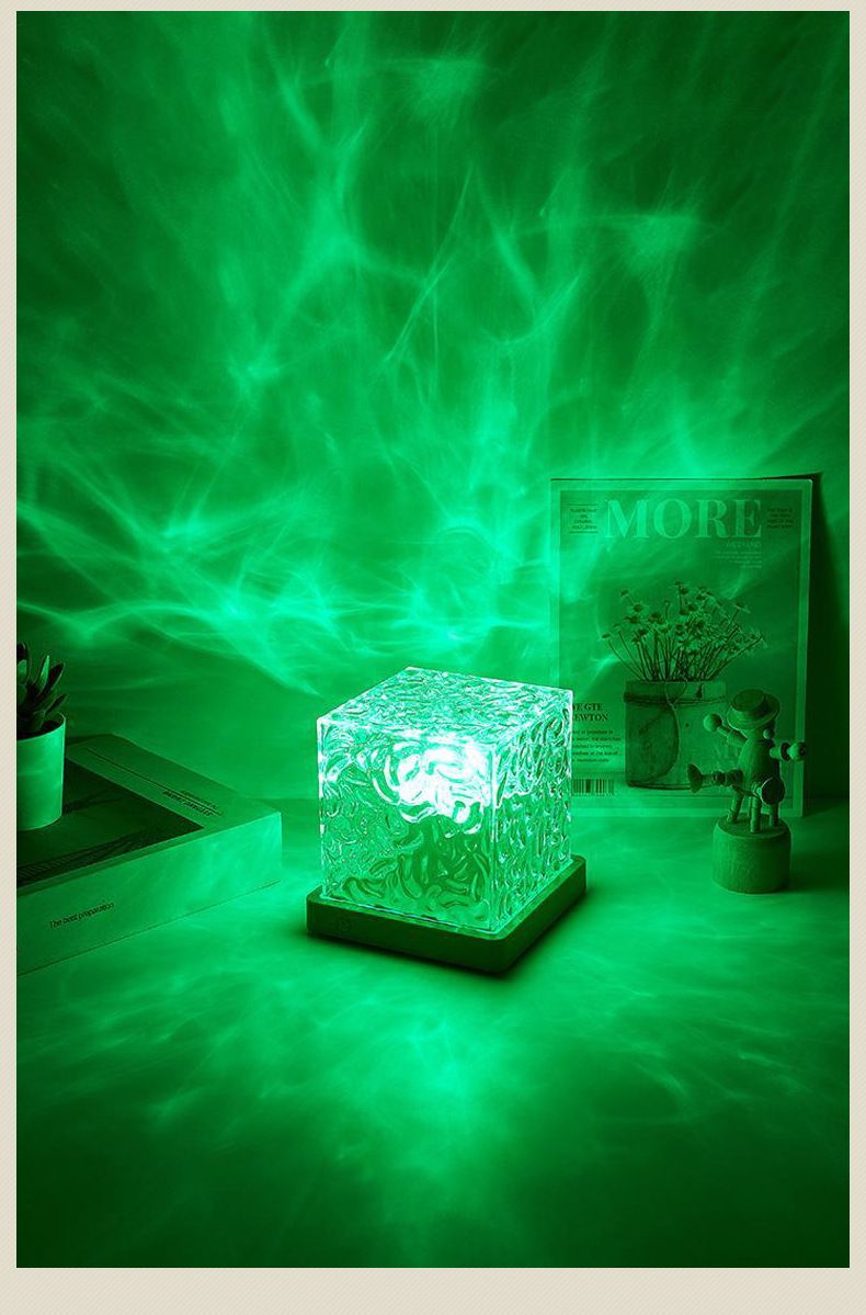This water ripple crystal cube projection lamp is a must-have item for creating an atmosphere. It is made of high-transparency crystal material and has an internal LED light source. It can project 3D dynamic water ripple light effects, and can switch between 16 different colors. It can create various romantic effects such as a starry sky and an ocean.