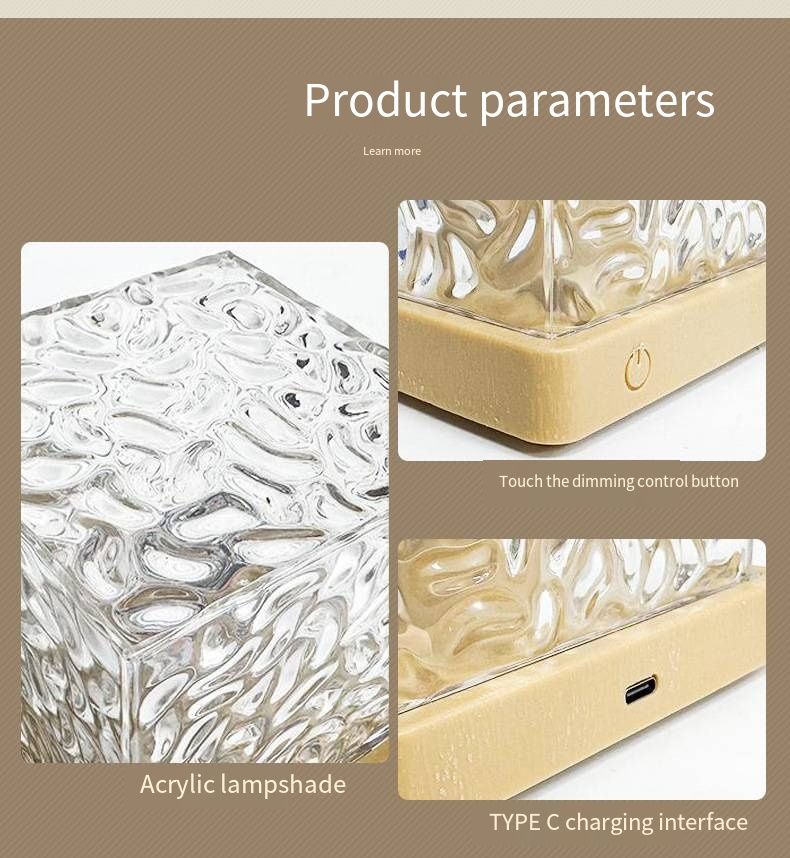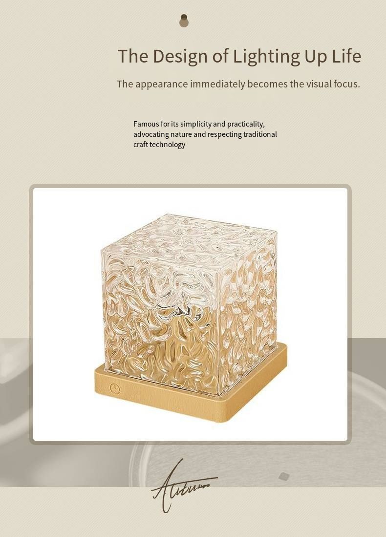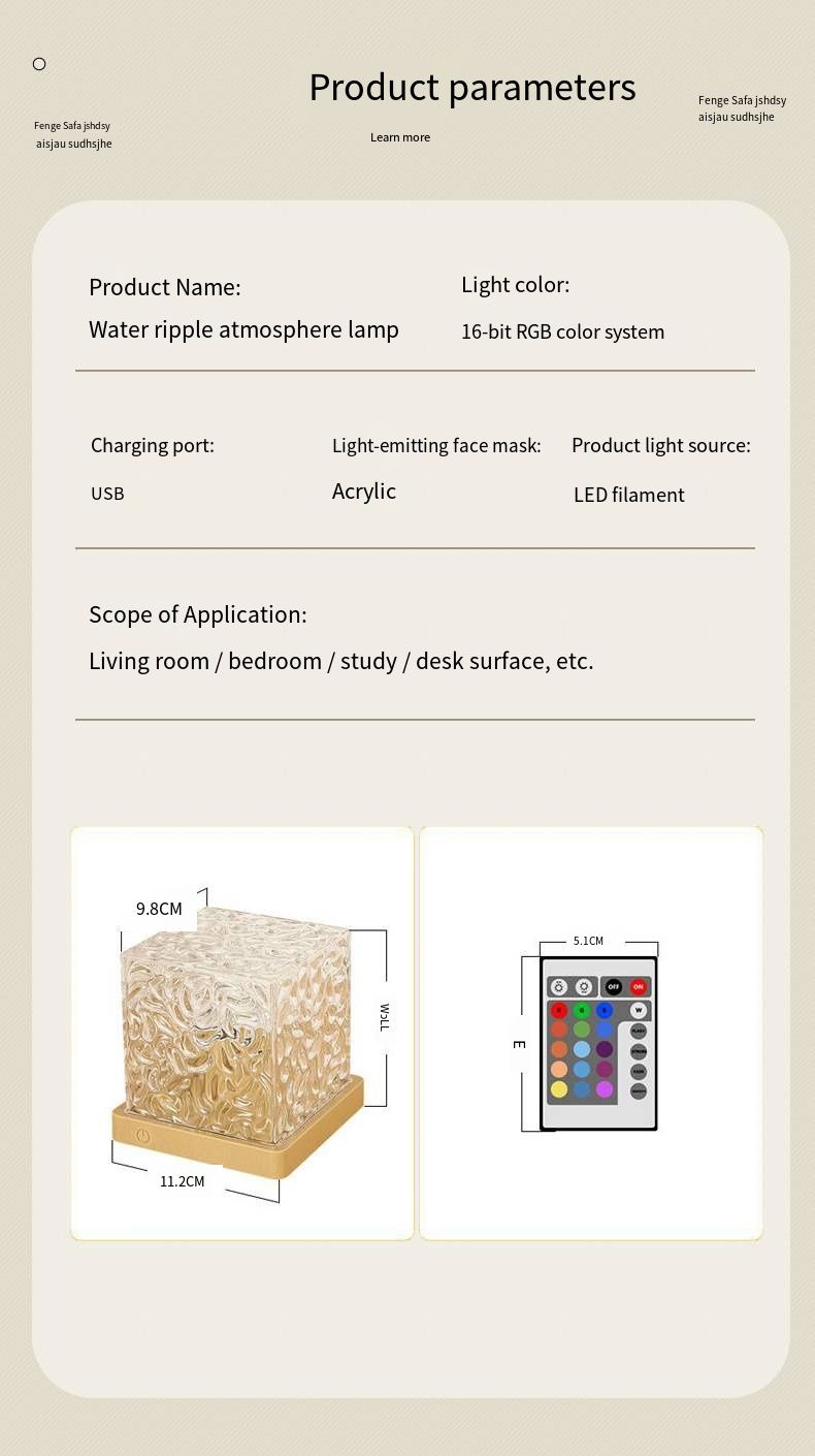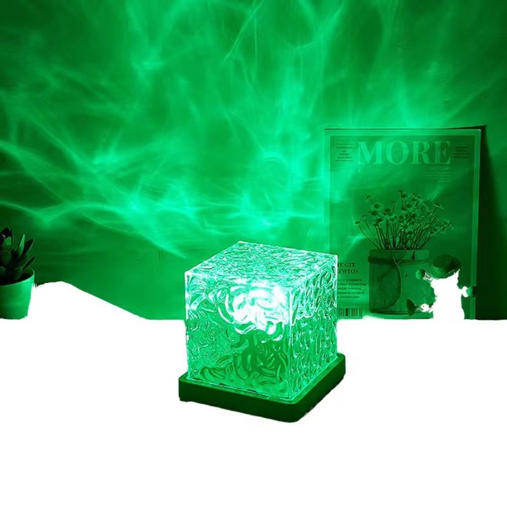 This water ripple crystal cube projection lamp is a must-have item for creating an atmosphere. It is made of high-transparency crystal material and has an internal LED light source. It can project 3D dynamic water ripple light effects, and can switch between 16 different colors. It can create various romantic effects such as a starry sky and an ocean.