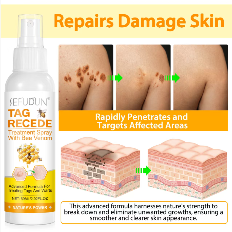 Order today and you will receive 3 bottles of Tag Resede Bee Venom Direct-to-Site Rapid and Safe Painless Wart Removal Spray. This spray is formulated with natural plant extracts and can gently block the nutrients supply to the warts, causing them to fall off painlessly and without leaving any marks. The spray is designed to be convenient and precise, and can effectively repair skin imperfections. Even sensitive skin can be used with confidence.