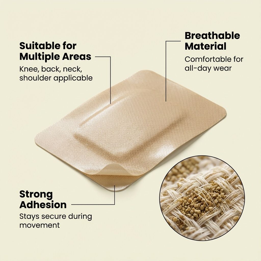 The material design of the patch is also carefully crafted: the high elasticity and breathable fabric can closely fit the curves of the knees, neck, shoulders, back and other joints throughout the body. Whether bending over, raising your hands or walking, it can flexibly extend with your body movements without causing a tight feeling. The strong adhesive medical-grade layer ensures that the patch does not fall off, even if you sweat or take a bath, and remains stable without the need for frequent adjustments.
