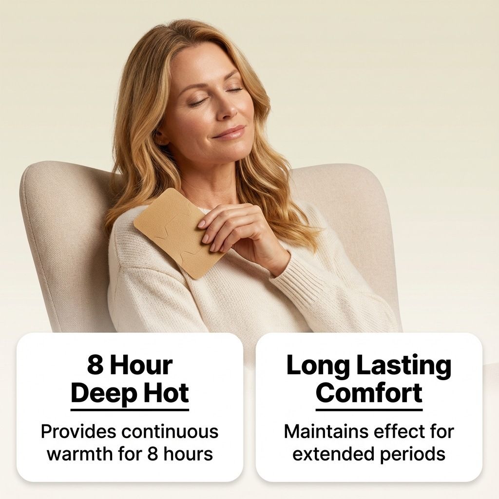 Its core advantage stems from the natural herbal formula: ginger extract provides a warm and soothing sensation, glucosamine helps the joints become flexible, and vitamin E gently cares for the skin. The triple synergy penetrates deep into the tissues, addressing the pain and stiffness from the root. The 8-hour constant heat technology ensures that the heat continuously penetrates without cooling down over time, allowing you to enjoy lasting comfort during work, exercise or rest.