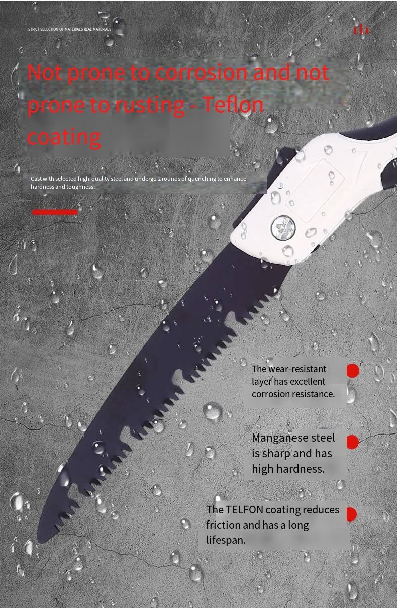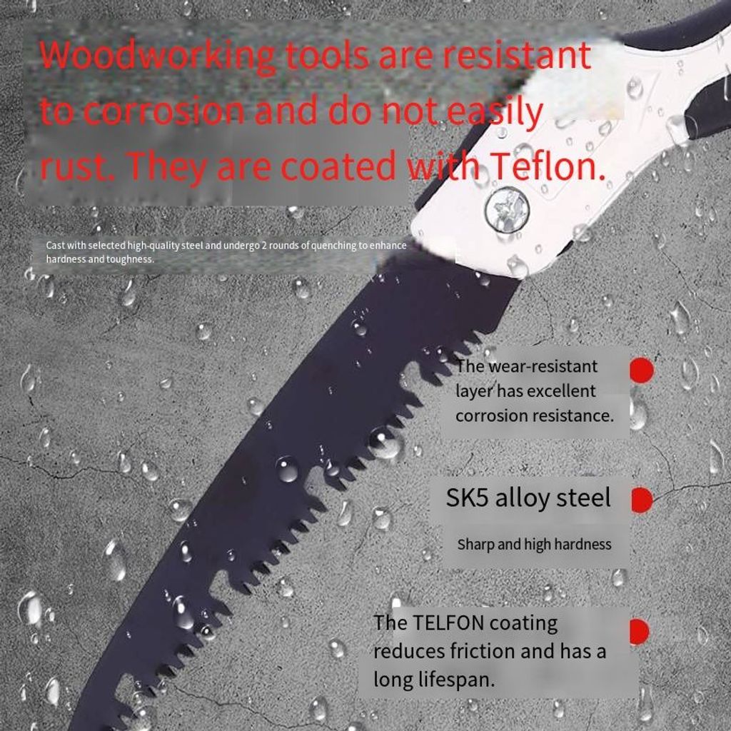 This professional-grade folding handsaw is an ideal assistant for pruning in gardens and woodworking. It is made of SK5 alloy steel and has undergone a double quenching process, significantly enhancing the hardness and toughness of the saw blade. The Teflon coating on the surface not only prevents rust and corrosion but also effectively reduces friction, avoiding jams and ensuring smooth cutting.