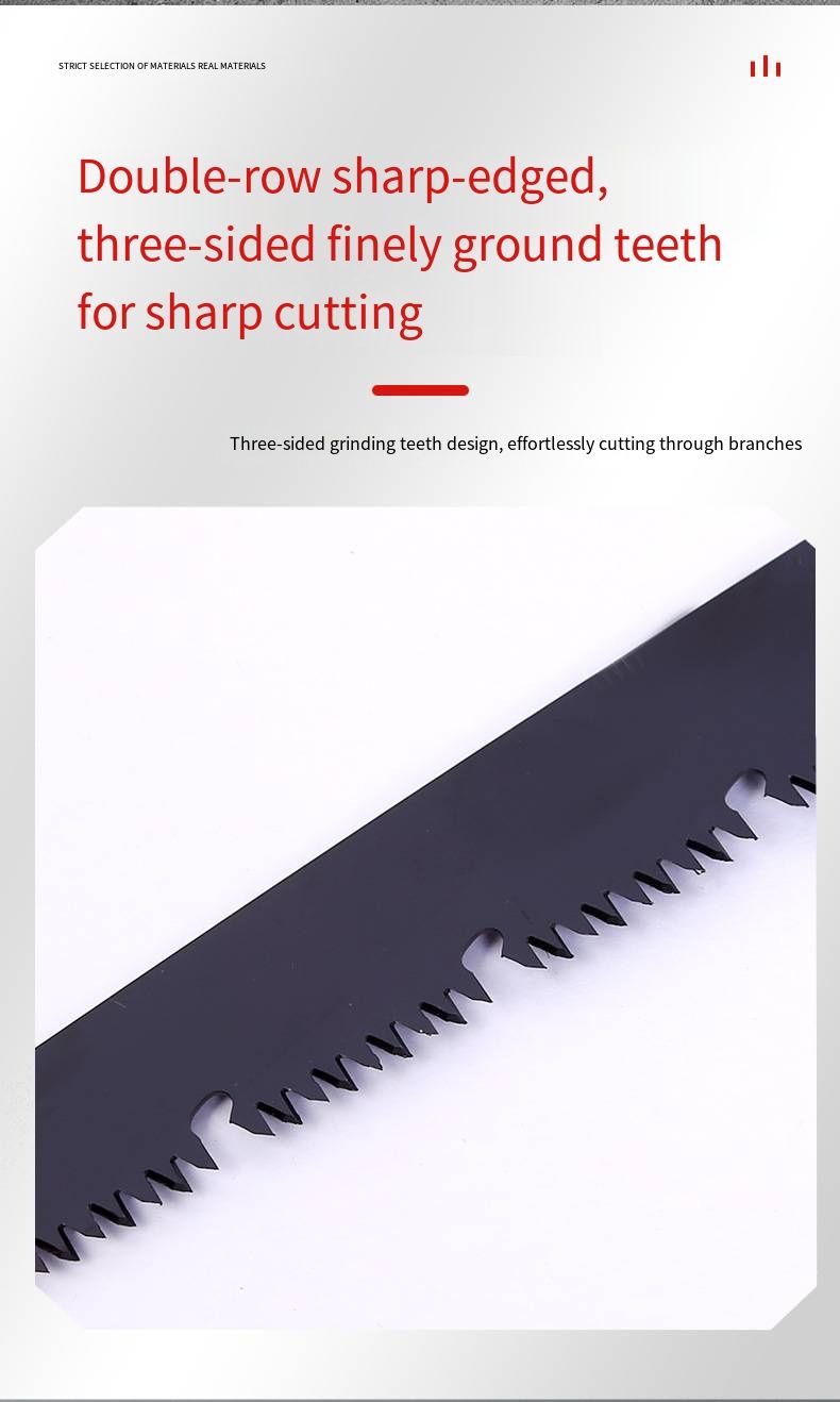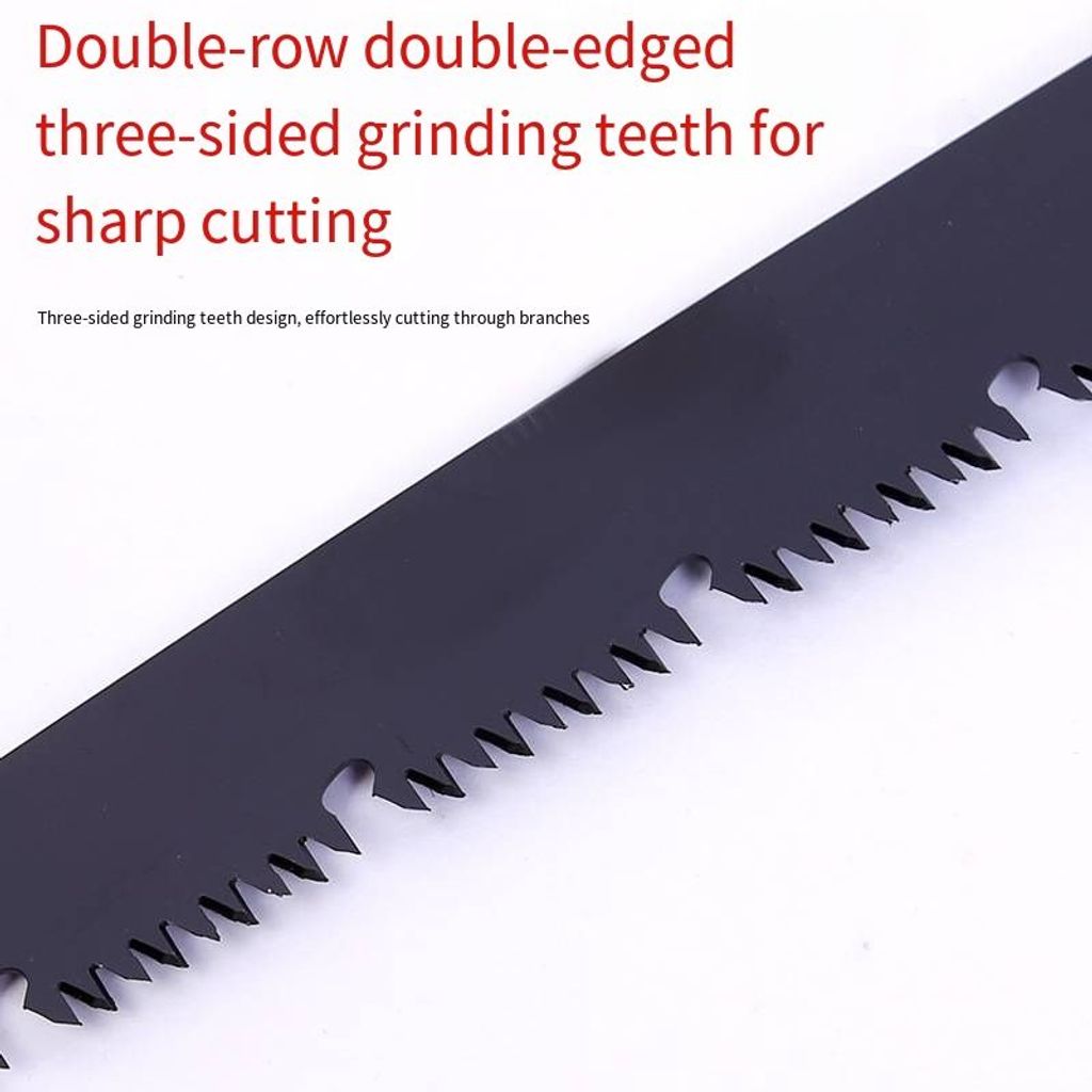 The saw blade features a double-row, double-sided, three-edge grinding design, which is a key difference from ordinary handsaws. The tooth shape is precisely ground, allowing for quick penetration into the material during cutting, reducing the number of reciprocating movements and making it more effortless for you. The double-row tooth structure increases the cutting surface, improves chip removal efficiency, and prevents wood chips from blocking, making each push and pull smoother. Whether trimming thick or thin branches or cutting solid wood boards, it can handle any task with ease.