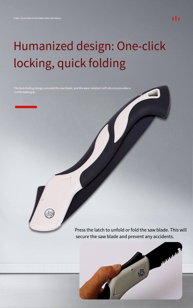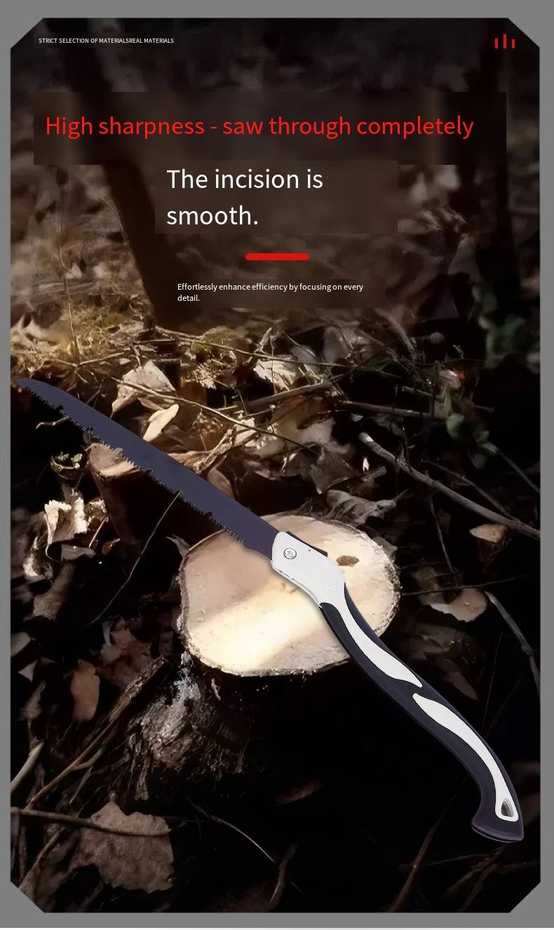 The handle is designed with ergonomic curves, featuring a non-slip texture that fits the palm, making it less prone to fatigue even during long use. The folding structure significantly reduces the tool's size when stored, allowing it to be easily placed in a backpack or toolbox, without taking up space. Whether for home garden pruning, outdoor camping logging, or DIY woodworking scenarios, it is always ready to go.