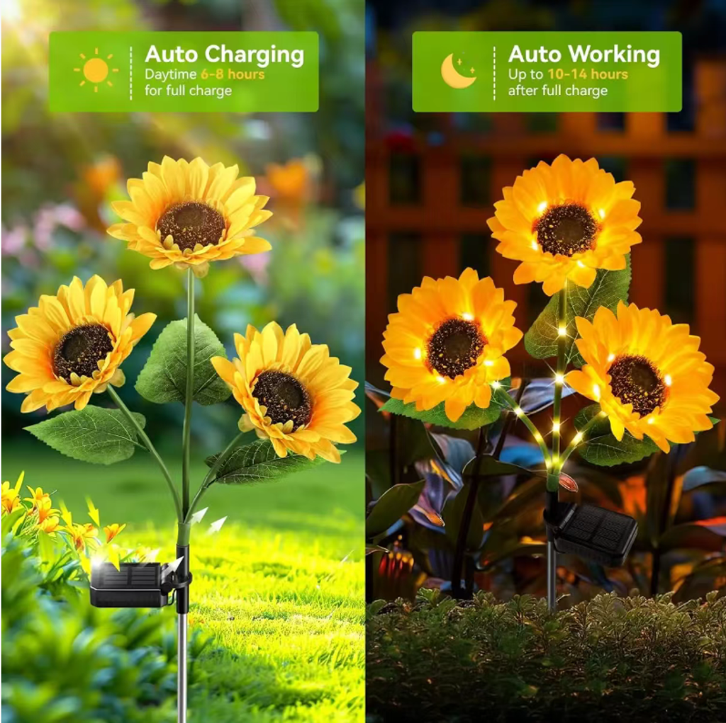 Order today and you will receive 3 solar-powered sunflower outdoor courtyard ground lamps. No wiring is required and they automatically turn on and off. With 6 to 8 hours of sunlight, their lighting duration can reach 10 to 14 hours. The IP65 waterproof design can withstand rain and wind. Multiple units can be combined to create an atmosphere-filled courtyard space. It is an ideal choice for outdoor lighting and decoration, with a therapeutic effect. 复制