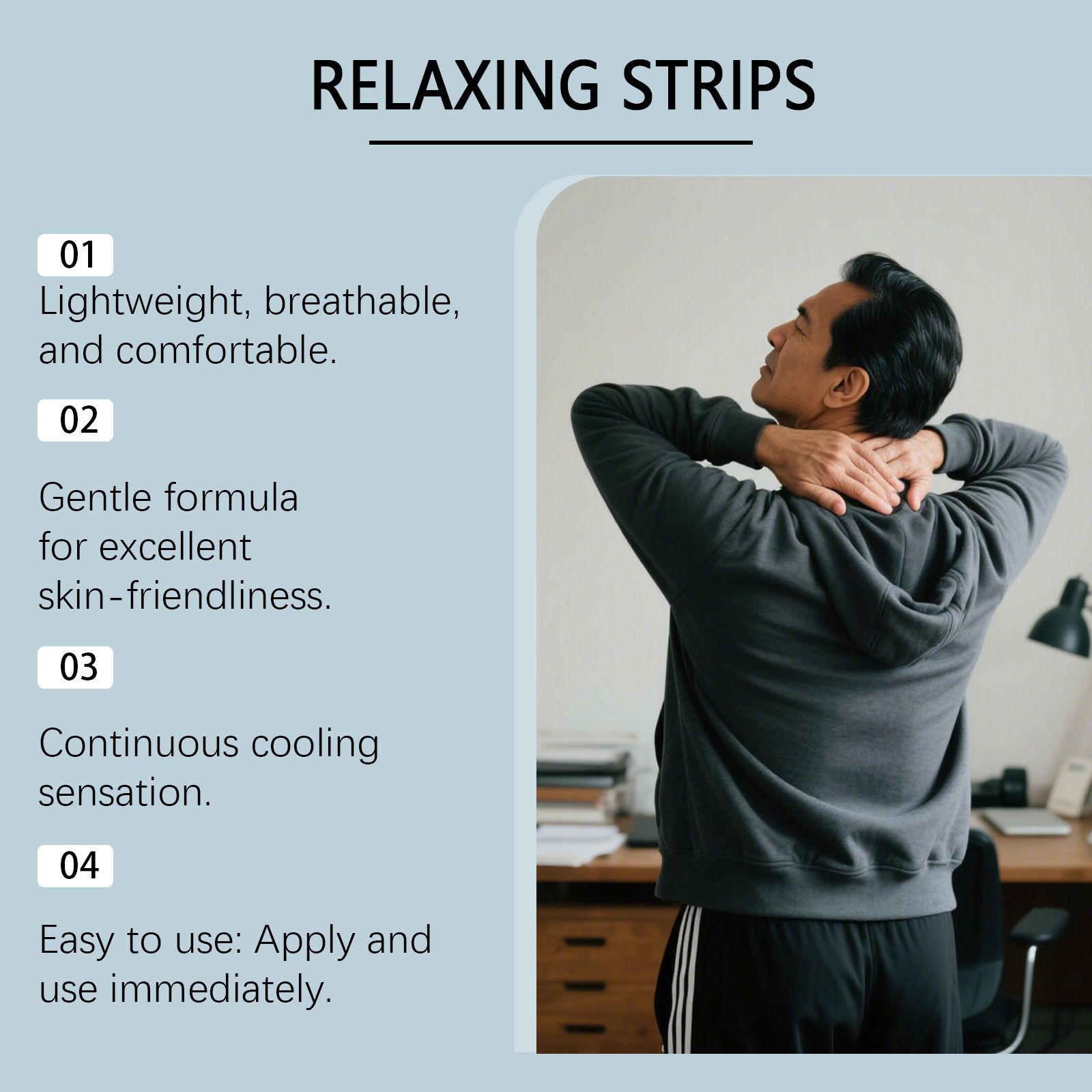 In the fast-paced daily life and the accumulation of time, joint pain has gradually become a common problem for the entire family - office workers suffer from stiff shoulders and necks due to prolonged sitting, middle-aged and elderly people experience sore knees after walking and shopping, and those engaged in household chores feel discomfort in their backs and necks. A gentle and effective joint care product has become increasingly important. Relaxing Strips, a herbal joint relief patch, is specially designed for joint care in various scenarios. With natural extracts and scientific formulas, it safeguards the joint health of the entire family.