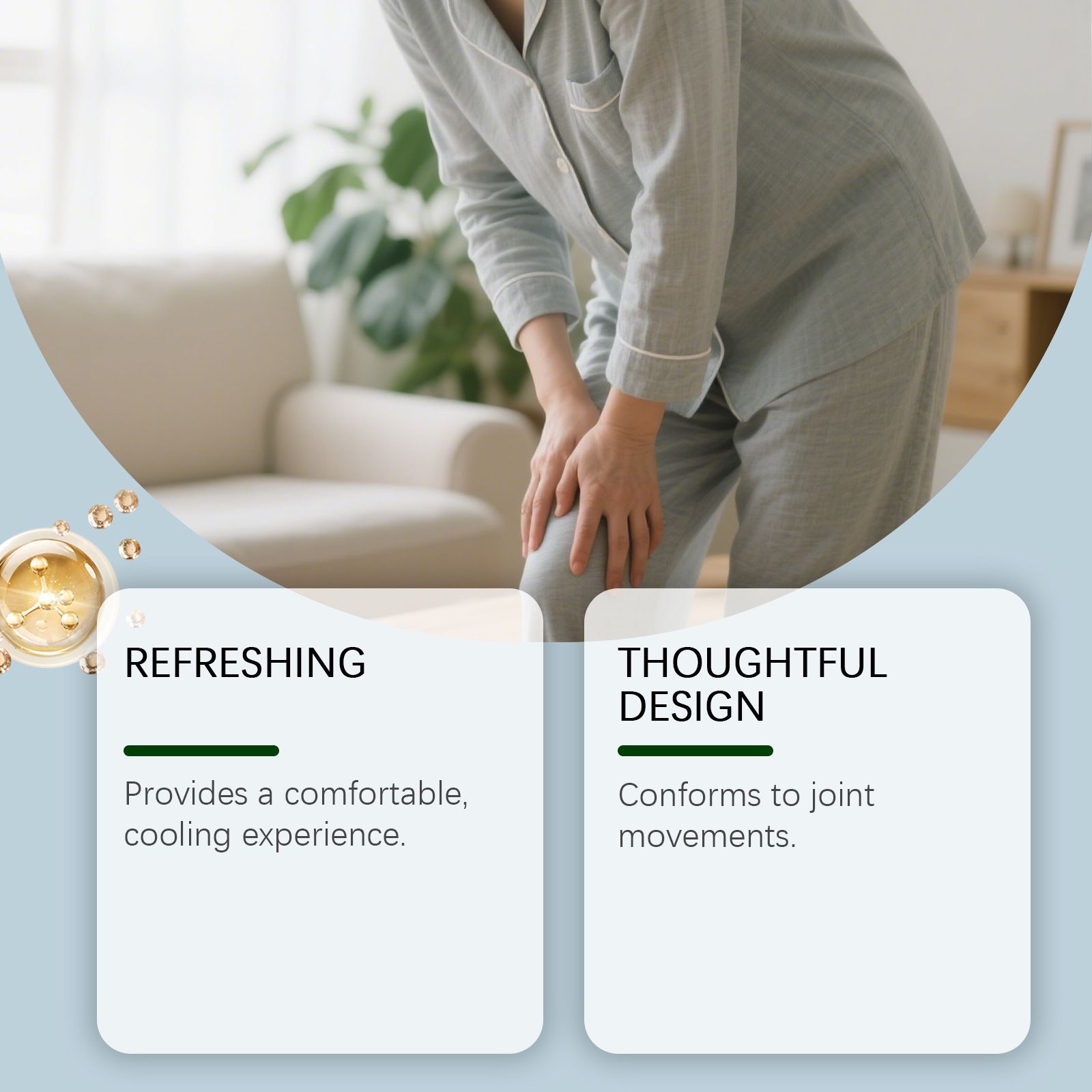 In terms of the formula, the selected essential oil of mugwort is used, which has a gentle penetration ability to directly reach the affected areas, relieving joint pain and stiffness. It inherits the concept of herbal care and is gentle and non-irritating. It also adds allantoin, which repairs the skin barrier and reduces frictional irritation during application, making it suitable for sensitive skin. It is combined with glycerin to lock in moisture and provide long-term hydration for the skin, avoiding local dryness and tightness after application, and enhancing the wearing comfort.