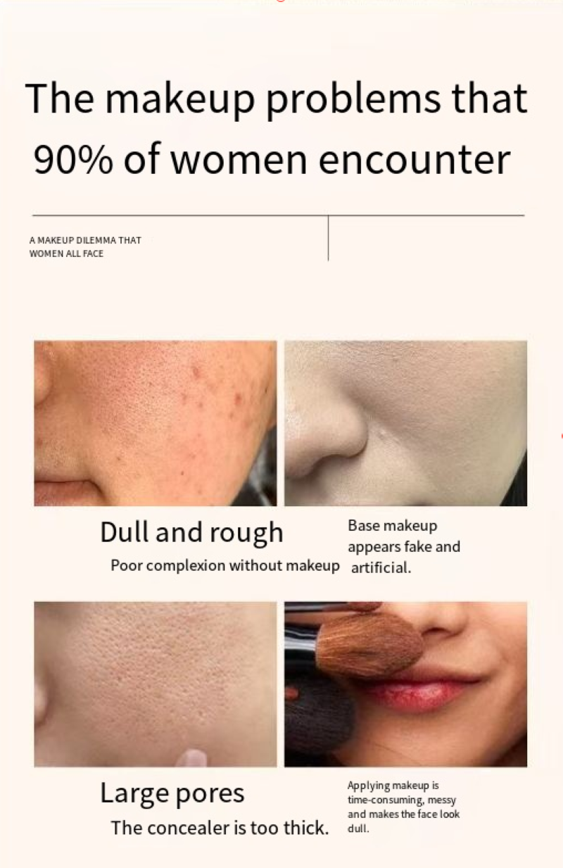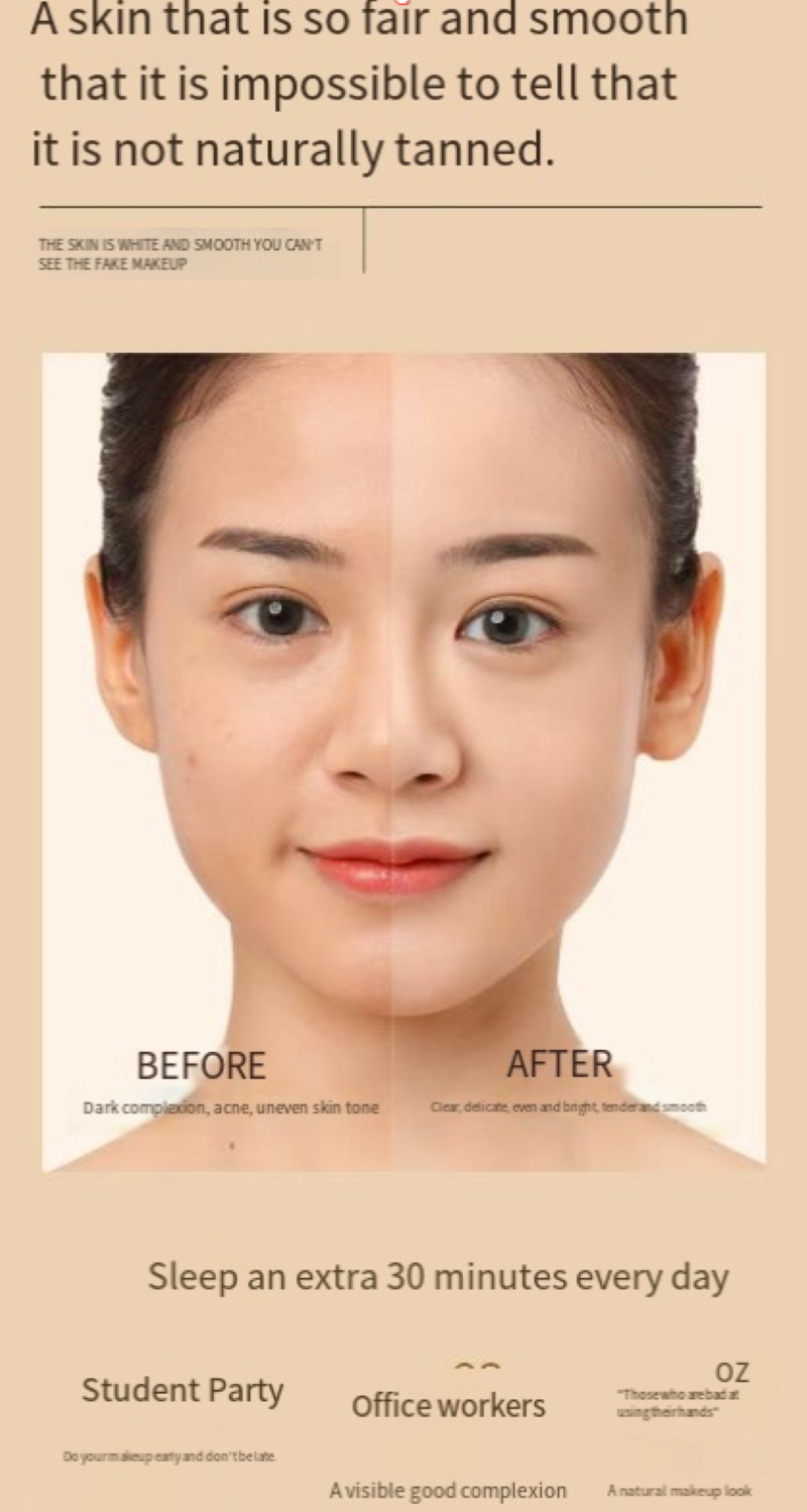 It is centered around bosiein and white rose extract. Bosiein helps repair the skin barrier and strengthens the skin's ability to retain moisture. White rose brings a gentle moisturizing effect. It can be used for both makeup application and skincare, ensuring no powder caking on dry skin in winter or no acne breakout on oily skin in summer. Sensitive skin can also try it with peace of mind. The cream-like smooth texture melts upon application and can be quickly spread evenly without the need for makeup tools. There will be no lumps or false whiteness. It can naturally cover redness, dullness and pores, giving the skin a transparent "motherly good skin" texture. It is not a dead white but a brightening that matches one's own skin tone. It makes yellow skin look more balanced and white skin look more transparent when used.