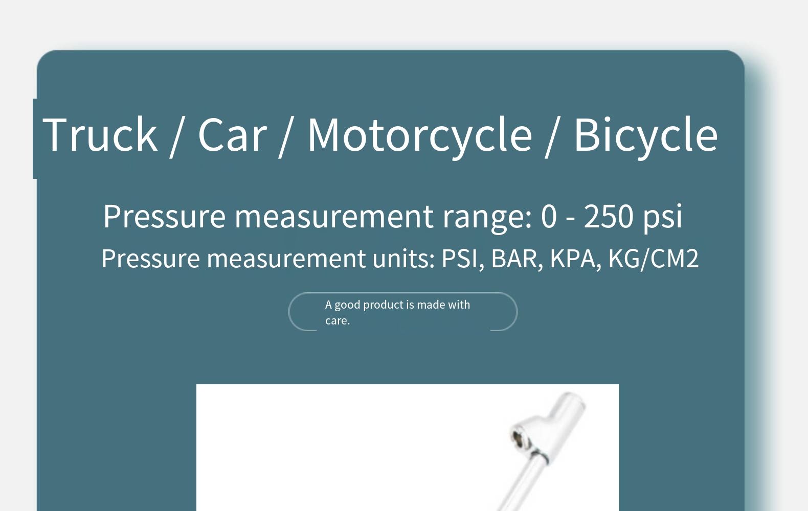 It features a shock-resistant and anti-slip ergonomic grip design, providing not only comfortable holding but also the ability to withstand bumps and oil stains in auto repair scenarios, with durability far exceeding that of ordinary tire pressure gauges. It has a wide range of compatibility, not only for heavy vehicles such as trucks and buses, but also perfectly compatible with cars, motorcycles, and bicycles. Whether it's professional auto repair personnel or self-driving enthusiasts, they can use it to monitor tire pressure in real time and avoid the risk of tire blowouts, ensuring driving safety.