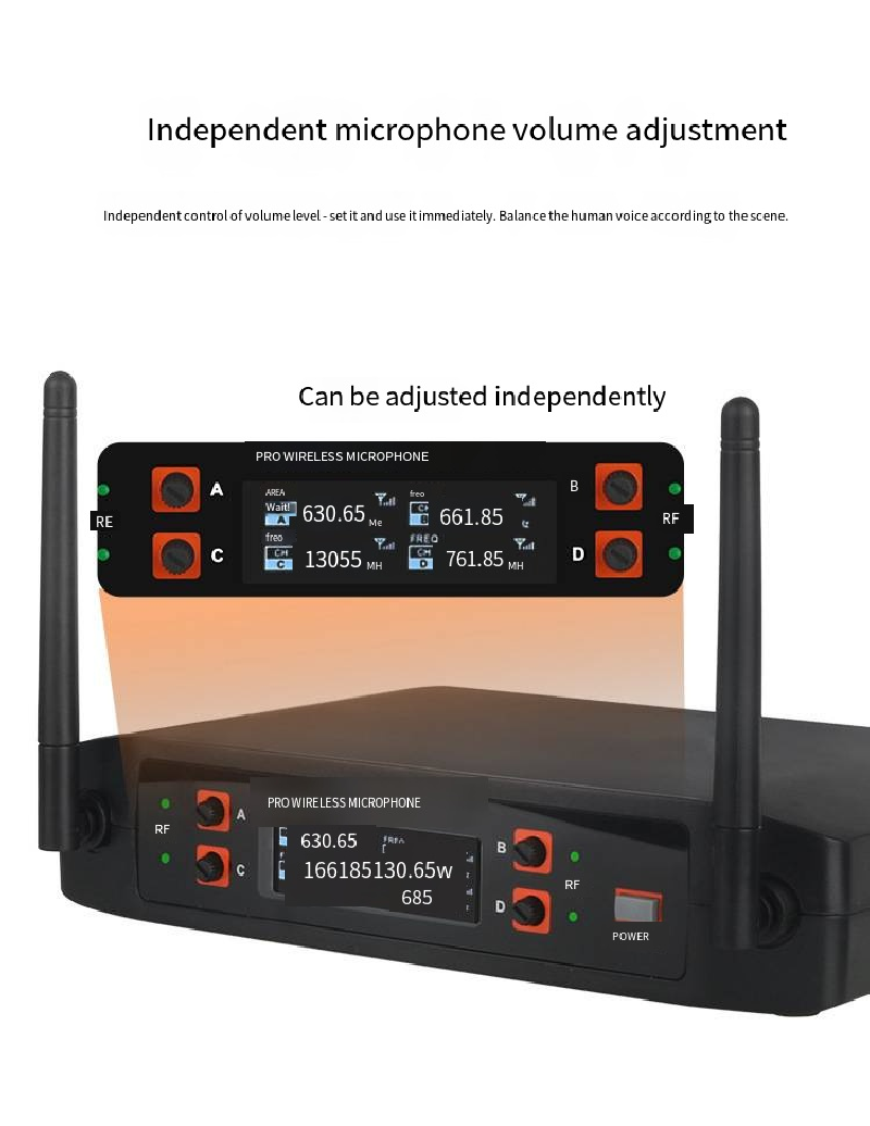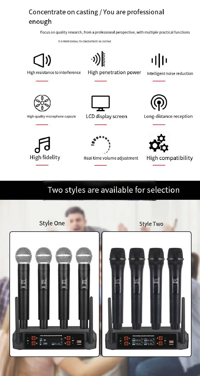 Professional U Section 1-4 Wireless Microphone Set - Four-channel independent frequency modulation with dual antennas for enhanced signal transmission. Anti-crowd-noise, high-fidelity dynamic coil microphone core. Metal body for durability and reliability. Suitable for stage performances, business meetings, home karaoke, wedding ceremonies, outdoor roadshows, versatile for multiple scenarios. Comes with LCD screen for real-time frequency monitoring and handheld microphone.