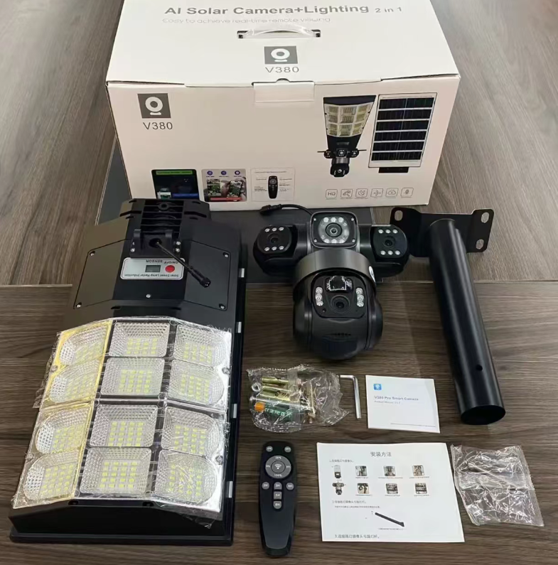 Solar-powered monitoring street lamp integrated device, no wiring required and no electricity cost. Efficient solar panel power supply, capable of lasting 3-5 days even in rainy days. 360° all-round monitoring + high-brightness lighting combined. AI human shape detection, two-way voice communication. IP66 waterproof and dustproof. Easy installation. It is an essential outdoor security solution for courtyards, farms, and construction sites.