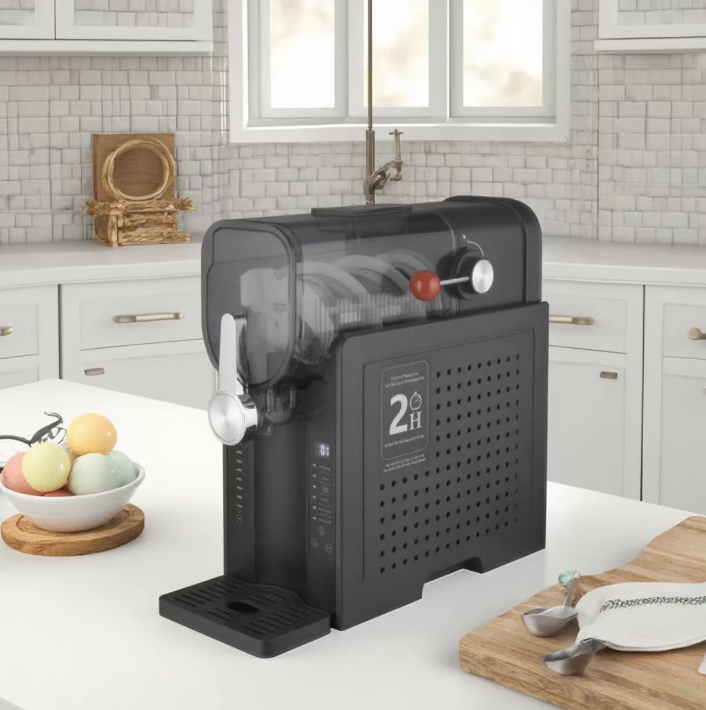 The machine is simple and compact, suitable for kitchen countertops and living room coffee tables, looking beautiful and not taking up space. The transparent viewing chamber allows you to observe the production progress at any time, combining aesthetics and practicality. Whether it's watching TV at home, children's afternoon tea, or a friend gathering, you can provide refreshing cold drinks at any time, enhancing the happiness of home life.