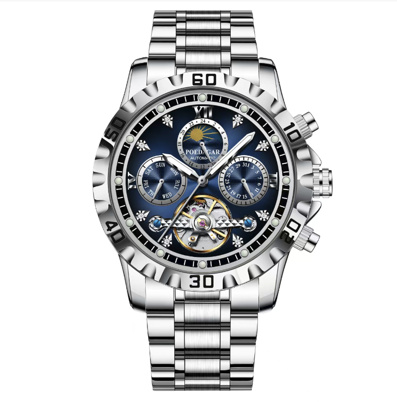 The new model of Swiss brand automatic mechanical men's watch features a hollow rotor that showcases the mechanical aesthetics. It comes with multi-function chronograph and moon phase calendar. The watch is made of stainless steel, which is durable and water-resistant. The blue dial and silver strap are versatile and suitable for various occasions. It has precise timekeeping and is an excellent high-end men's wristwatch for both business and leisure, as well as for personal gifts.