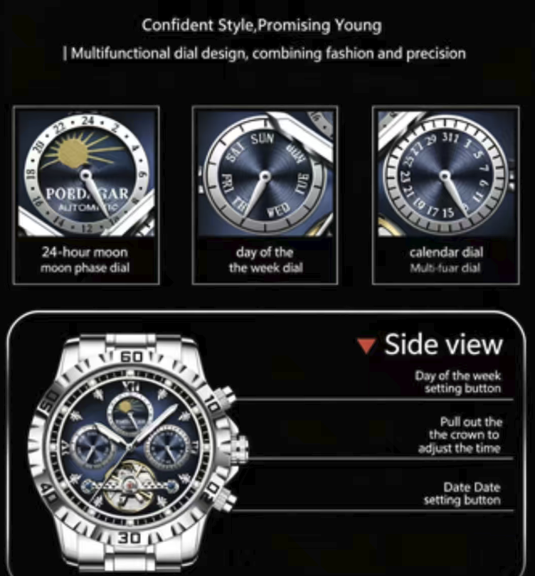 The hard lines of the watch body, the elegant design of the dial, the classic blue and silver color combination, is versatile and not picky about clothing, suitable for all scenarios such as business formal wear, casual sports, and evening social events. Whether it's a workplace elite, business person, or fashionable man, they can easily handle it, making it a must-have item for enhancing clothing quality and demonstrating identity and taste.
