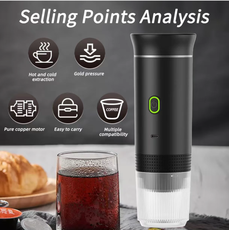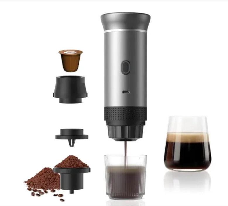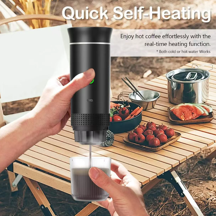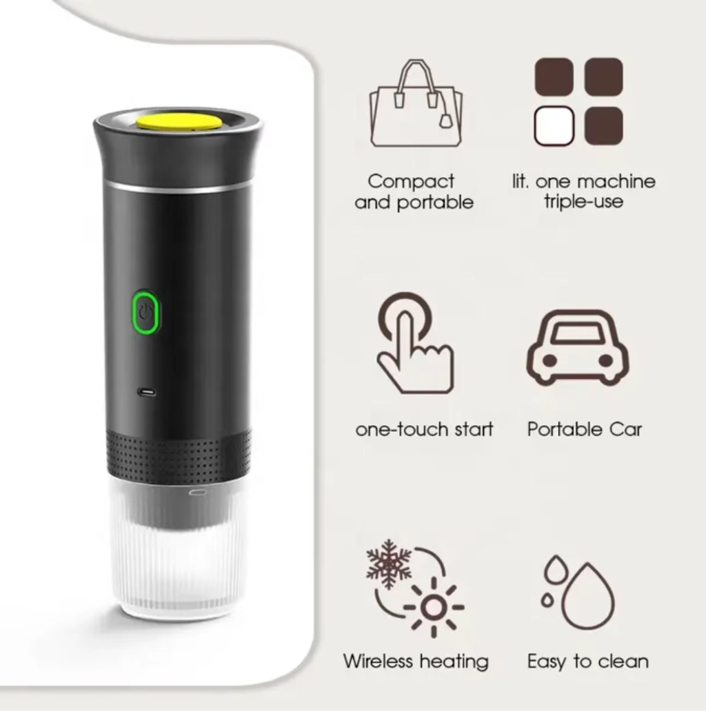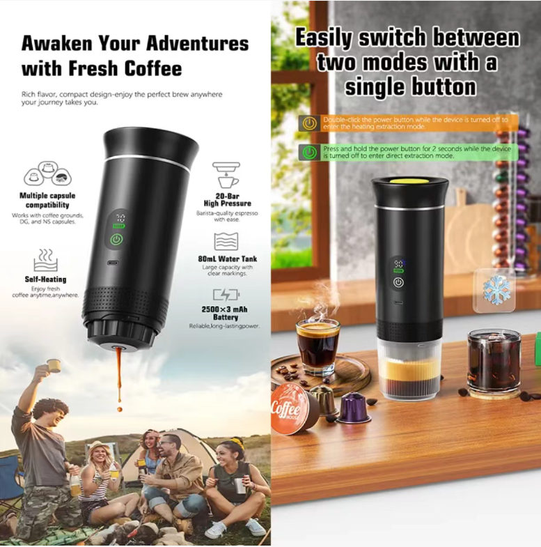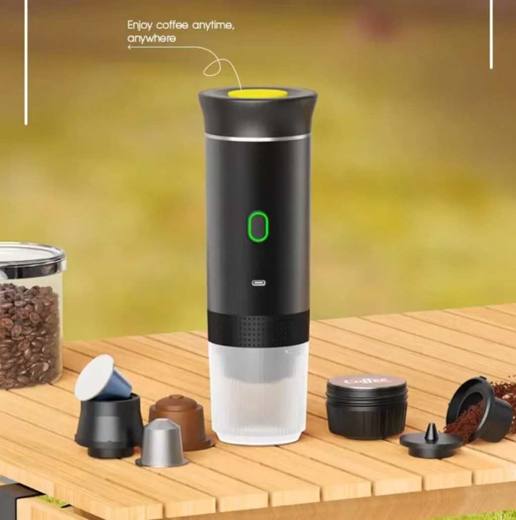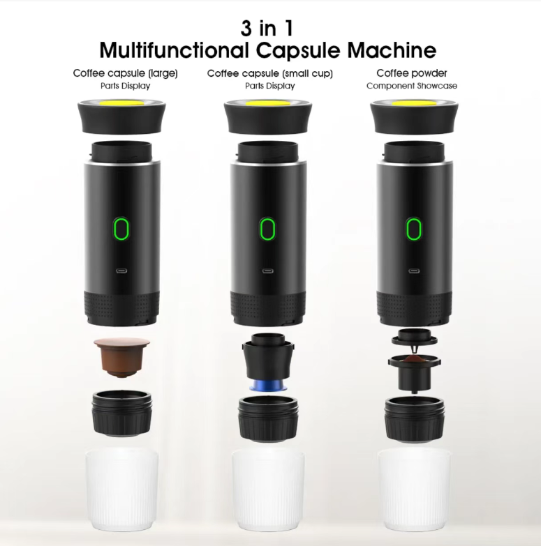 The three-in-one portable coffee machine supports both capsule and coffee powder modes. It uses 15Bar gold pressure to extract rich oils. It comes with 4-6 minutes of real-time heating. It can be started with one click, is wireless and portable, has IPX7 water resistance for easy cleaning, long-lasting Type-C charging, and allows you to enjoy freshly brewed coffee anytime and anywhere. Every time you want to have coffee, it brings you convenience.