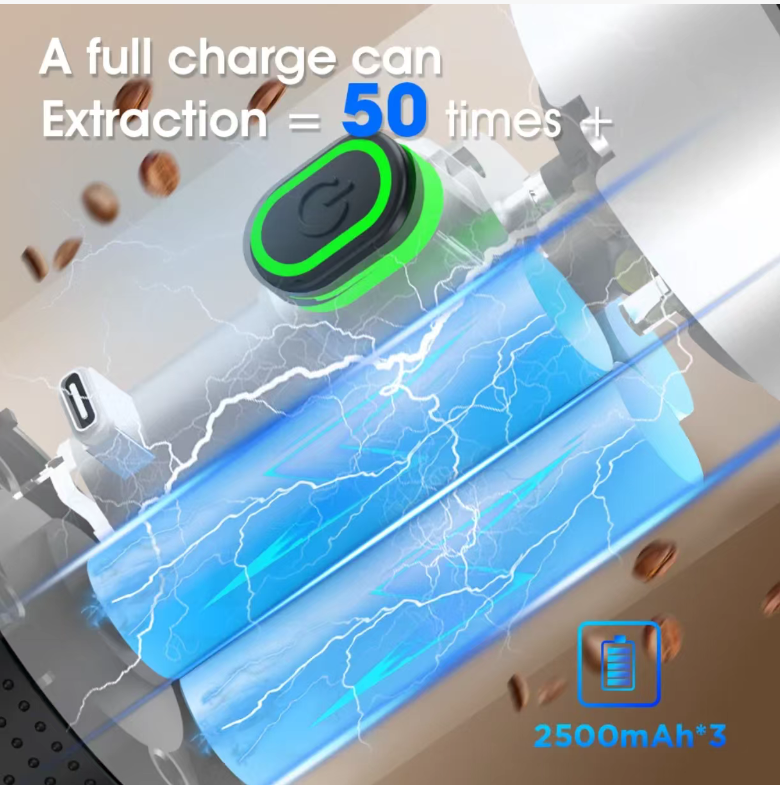 The machine is small and lightweight, and can be easily placed in a backpack or car cup holder. Whether on the commute, in the office, or during outdoor camping, you can enjoy it anytime. The IPX7 level waterproof design allows for easy cleaning. Just rinse it, and there won't be any coffee stains remaining. The Type-C charging port is compatible with various devices such as power banks and car chargers. One full charge can make up to 50 cups of coffee, with long-lasting battery life and no need for frequent charging.