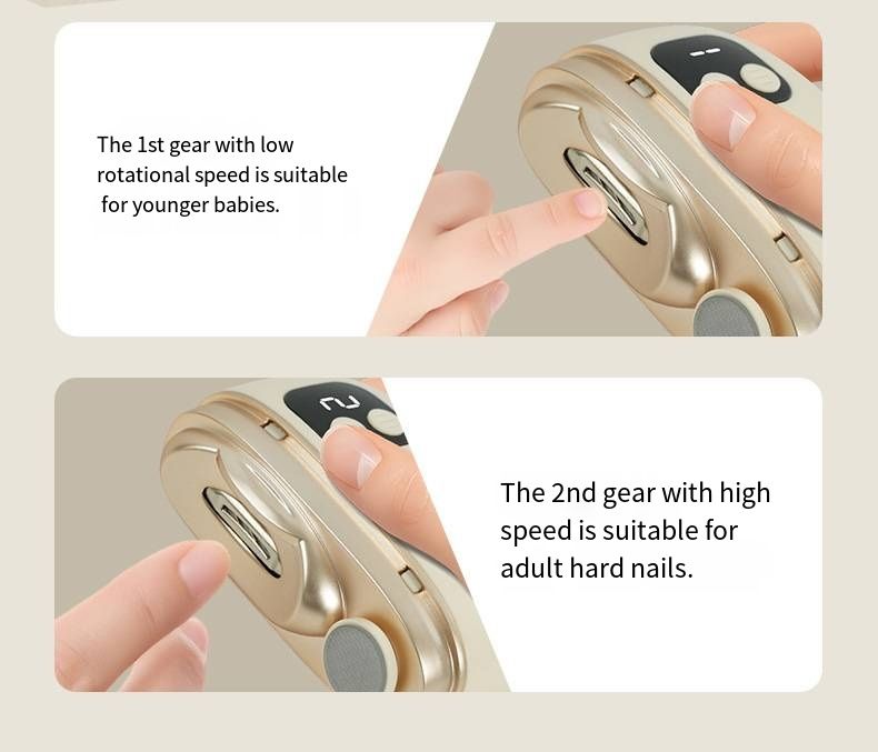 It has a safety lock specifically for babies to prevent nail clamping, and is equipped with a rounded R-shaped polishing head, so even if the baby suddenly moves, it won't hurt the delicate skin. The quiet operation at a low volume of 40 decibels won't wake up the sleeping baby, allowing you to do nail trimming peacefully even in the middle of the night. The multi-level adjustment function ranges from gentle to powerful, suitable for children aged 0-12, sensitive nails, and thickened nails of the elderly, truly achieving one machine to handle all family nail care.