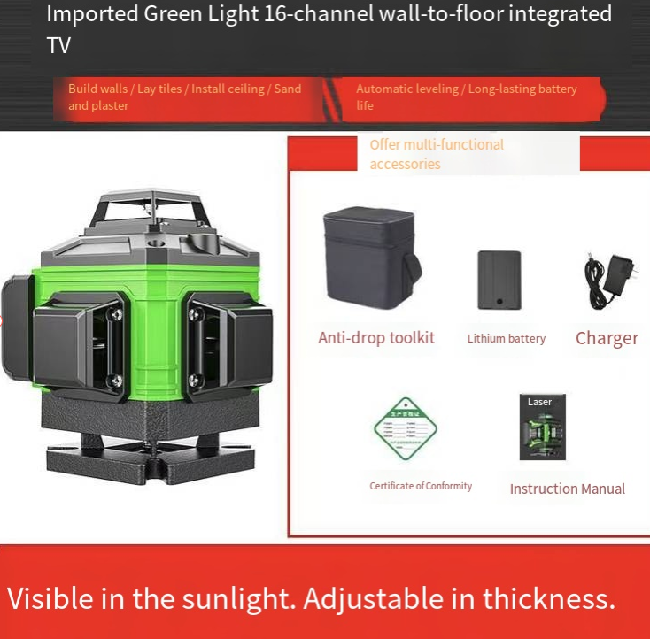 This 16-line green light level gauge features an imported green light source, which is clearly visible in strong light. It has 16 lines of coverage for all directions and is suitable for various processes such as wall construction and tile installation. The automatic leveling is precise and stable. Combined with a long-lasting battery and a complete set of accessories, it is an efficient and precise assistant for home renovation and construction.