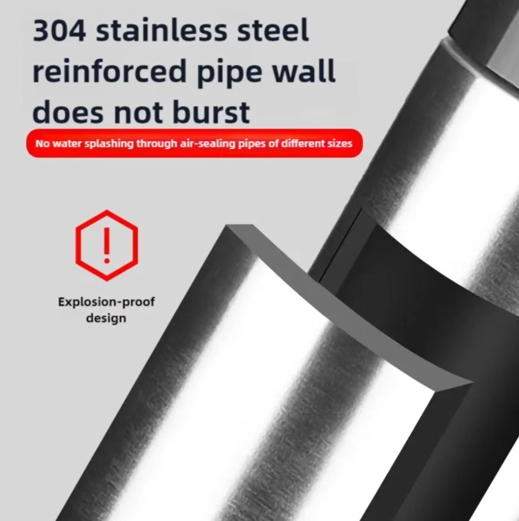 The upgraded thickened 304 stainless steel pipe wall has an explosion-proof design, significantly improving the pressure resistance. It is less likely to burst or deform during use. It is also equipped with different-sized sealing rubber heads, which closely fit the pipe opening, preventing water splashing and making the operation safer and more hygienic. You don't have to worry about getting dirty while performing the unclogging.