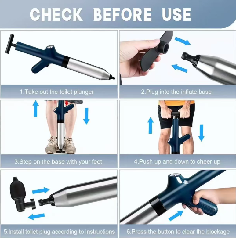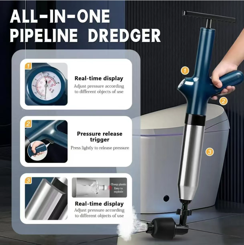 It features an 8-in-1 air compression pump design. By manually applying pressure, it instantly releases high-pressure air flow, creating a powerful impact force that directly targets the blockage source. Whether it's hair, oil stains, food residues, or hard objects stuck, they can all be forcefully cleared, saying goodbye to the embarrassing situation of traditional plunger devices repeatedly failing. Truly achieving "one blast to clear the blockage".