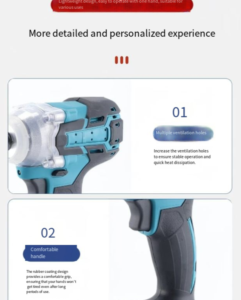 The large area of ventilation holes and grid air outlets on the body design allow for rapid cooling through multiple holes, preventing overheating during long-term operation, and effectively extending the machine's lifespan. The anti-slip ergonomic grip is comfortable to hold without slipping, making the operation more stable, and even during high-intensity operations, it can be easily controlled.