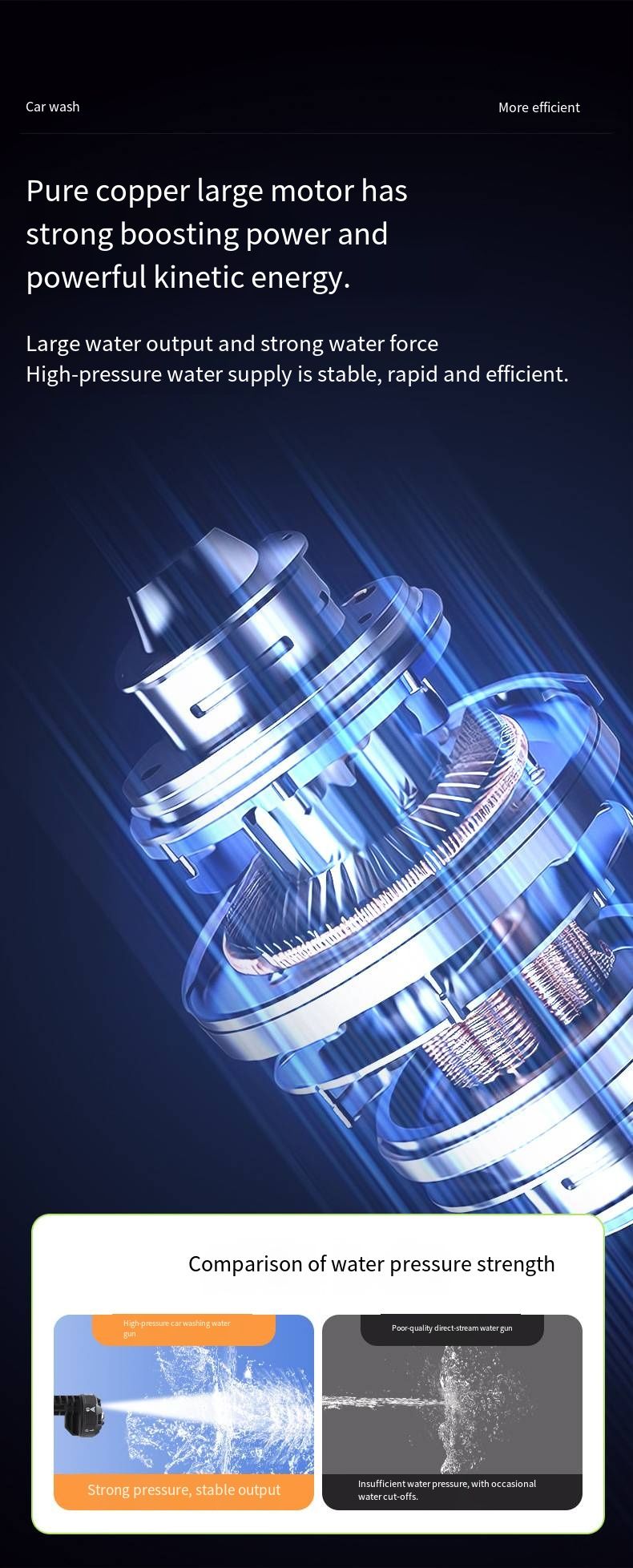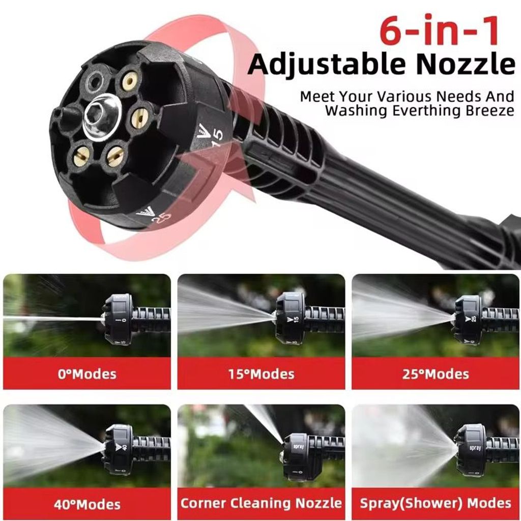 The core configuration is fully equipped. It features a 6-in-1 adjustable 360-degree nozzle that precisely meets various cleaning needs. It can spray water at high pressure to wash sand and mud, produce gentle water splashes to clean the vehicle body, and spray in a mist mode to water plants. This single machine can be used for multiple purposes without being idle. The dual water intake mode can be flexibly switched. The bucket suction mode is suitable for outdoor scenarios without water sources, and the direct connection to tap water mode is more convenient for home use.