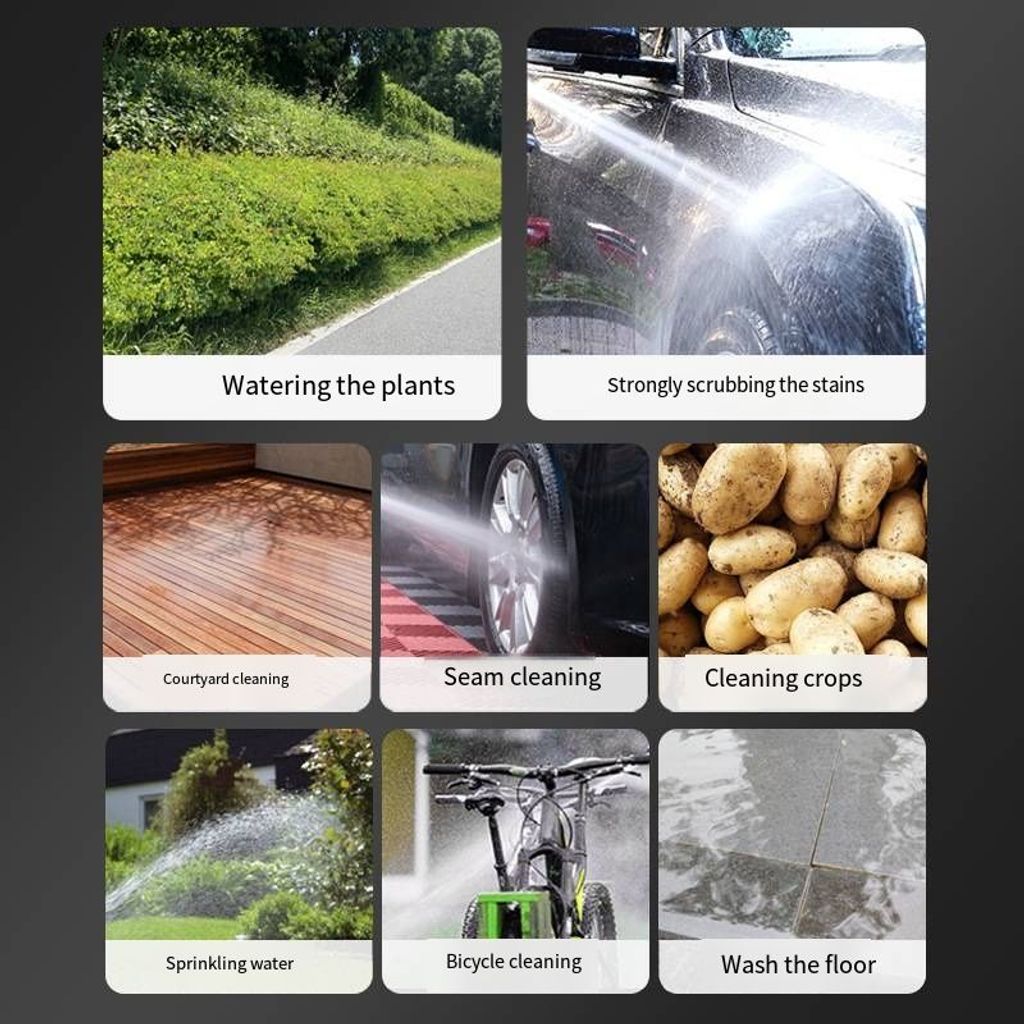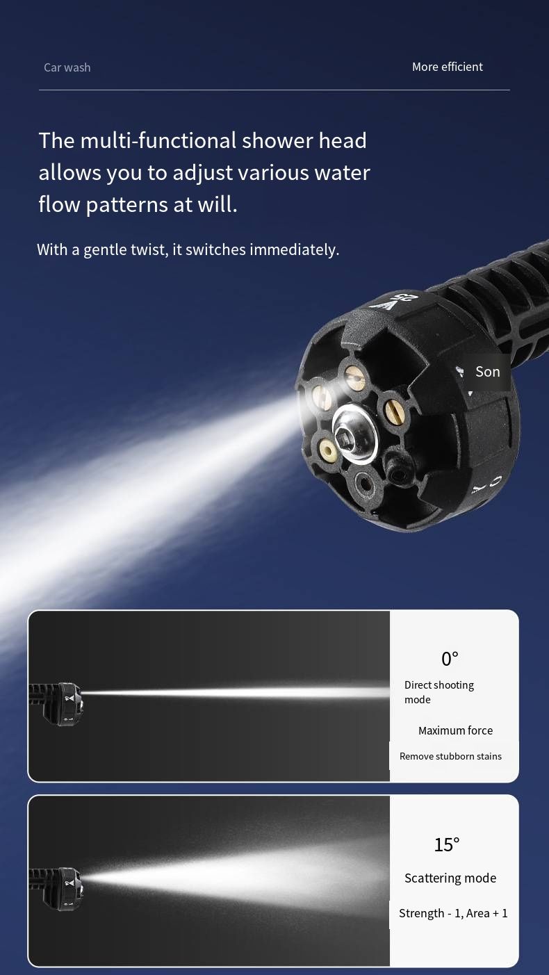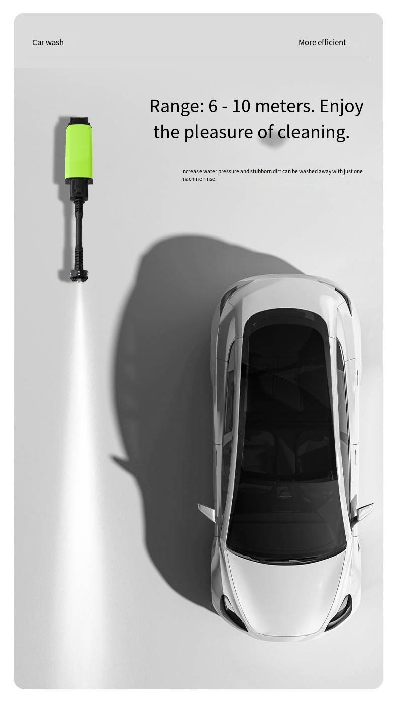 Equipped with a powerful high-pressure water pump, it can output stable high-pressure water flow. Combined with adjustable nozzles, it can not only form a concentrated water column to forcefully scrub the dirt and oil stains on the car bottom and wheels, but also switch to fan-shaped water mist to gently clean the car body paint surface. The high-pressure penetration power can easily break down stubborn stains, without the need for strenuous wiping. Say goodbye to the inefficiency and complexity of traditional car washing.