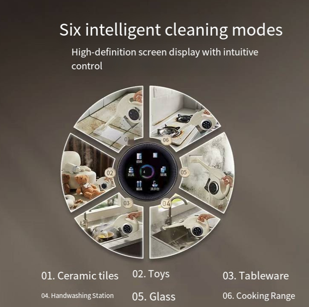 Equipped with a high-definition intelligent color screen, it precisely adapts to different scenarios with 6 cleaning modes: tile cleaning, toy disinfection, tableware sterilization, sink cleaning, glass de-staining, stove cleaning. Switch modes with one click, the operation is intuitive, even for the elderly, they can easily operate. Different modes correspond to different steam volumes, output as needed, energy-saving and efficient.