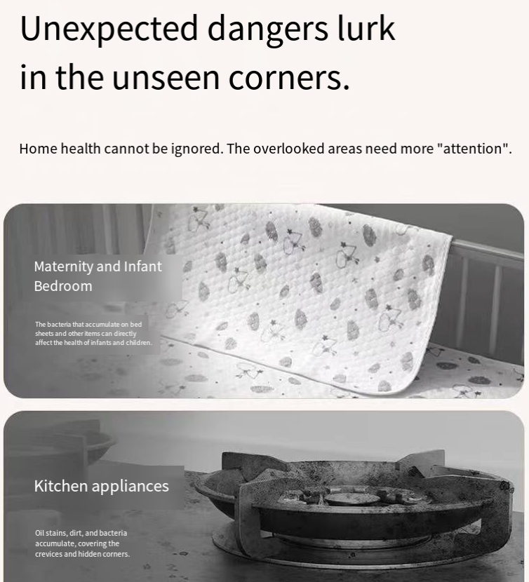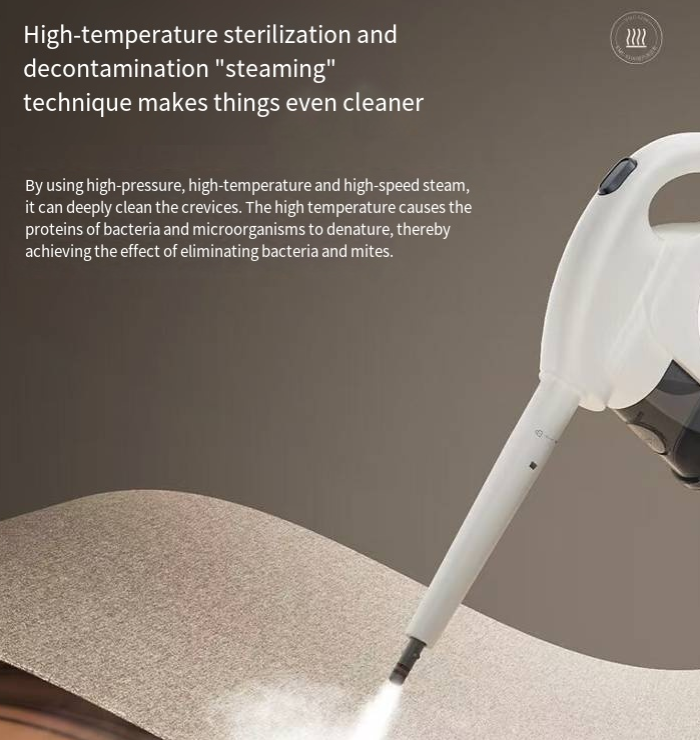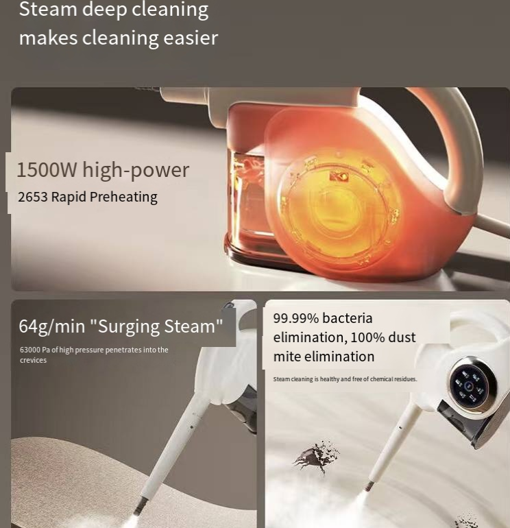 Equipped with a 1200W high-power heating system, it can quickly preheat in 22 seconds and instantly generate high-temperature and high-pressure steam of 120℃ or above. It can effectively penetrate oil stains, scale, and dirt, without the need for chemical cleaners. This physical cleaning method is healthier. At the same time, the high-temperature steam can achieve 99.9% efficient sterilization and dust removal, providing a more reassuring home environment for your family.