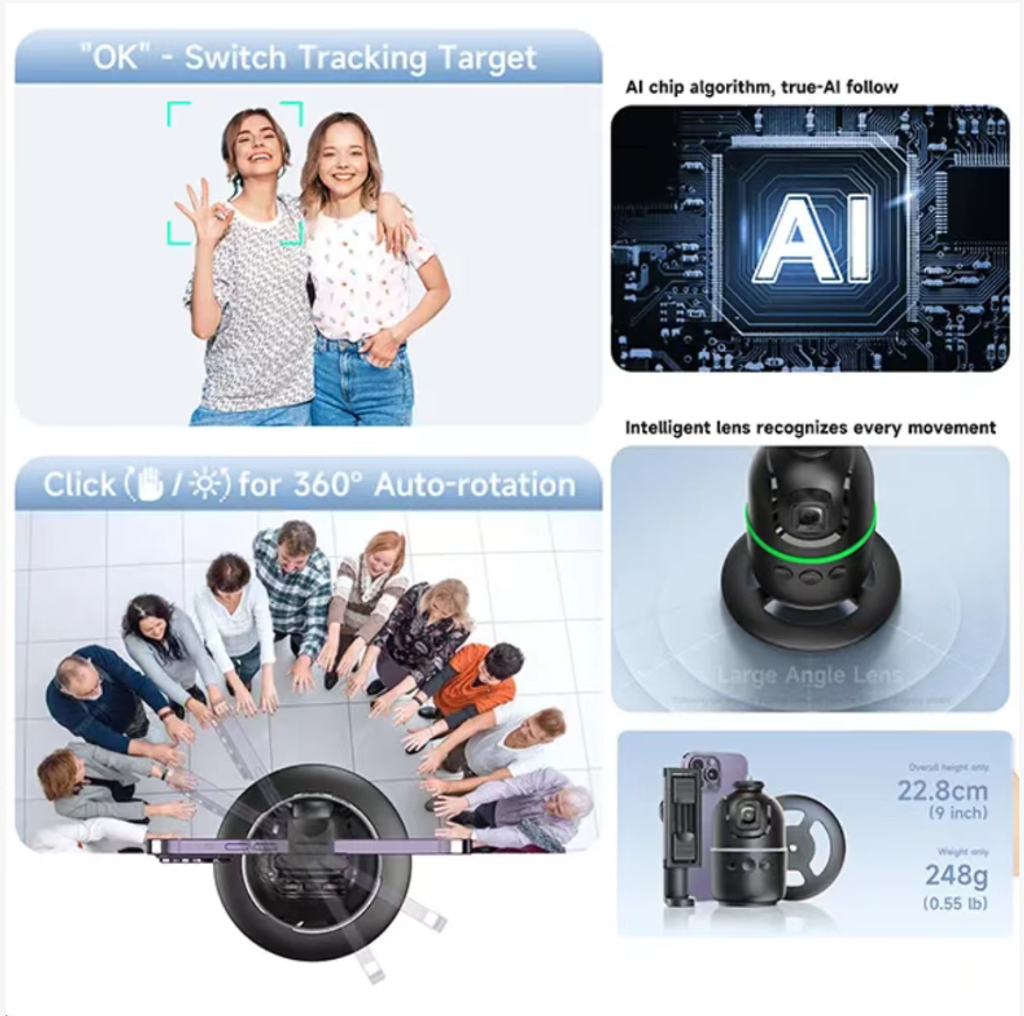 Its core feature is the AI intelligent follow-and-track technology: it comes with a high-definition camera and a facial recognition algorithm. It can rotate 360 degrees to track your face, no matter if you are running, turning, or moving away, the camera will remain firmly on you and there won't be any out-of-focus or missing picture issues. When taking vlogs of scenic spots during travel, you no longer need to trouble passersby for help; you can shoot an immersive video from the "main character's perspective" all by yourself. During live streaming, it frees your hands, you don't need to hold the phone, and the camera will automatically follow your movements, making the interaction more natural.